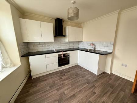 Three windows to front with distant countryside views, 5 base units under a granite effect worktop, electric hob and oven, stainless steel sink and drainer, extractor hood, space for a fridge freezer, tiled splash back, 2 radiators, part carpet/part cushion flooring.