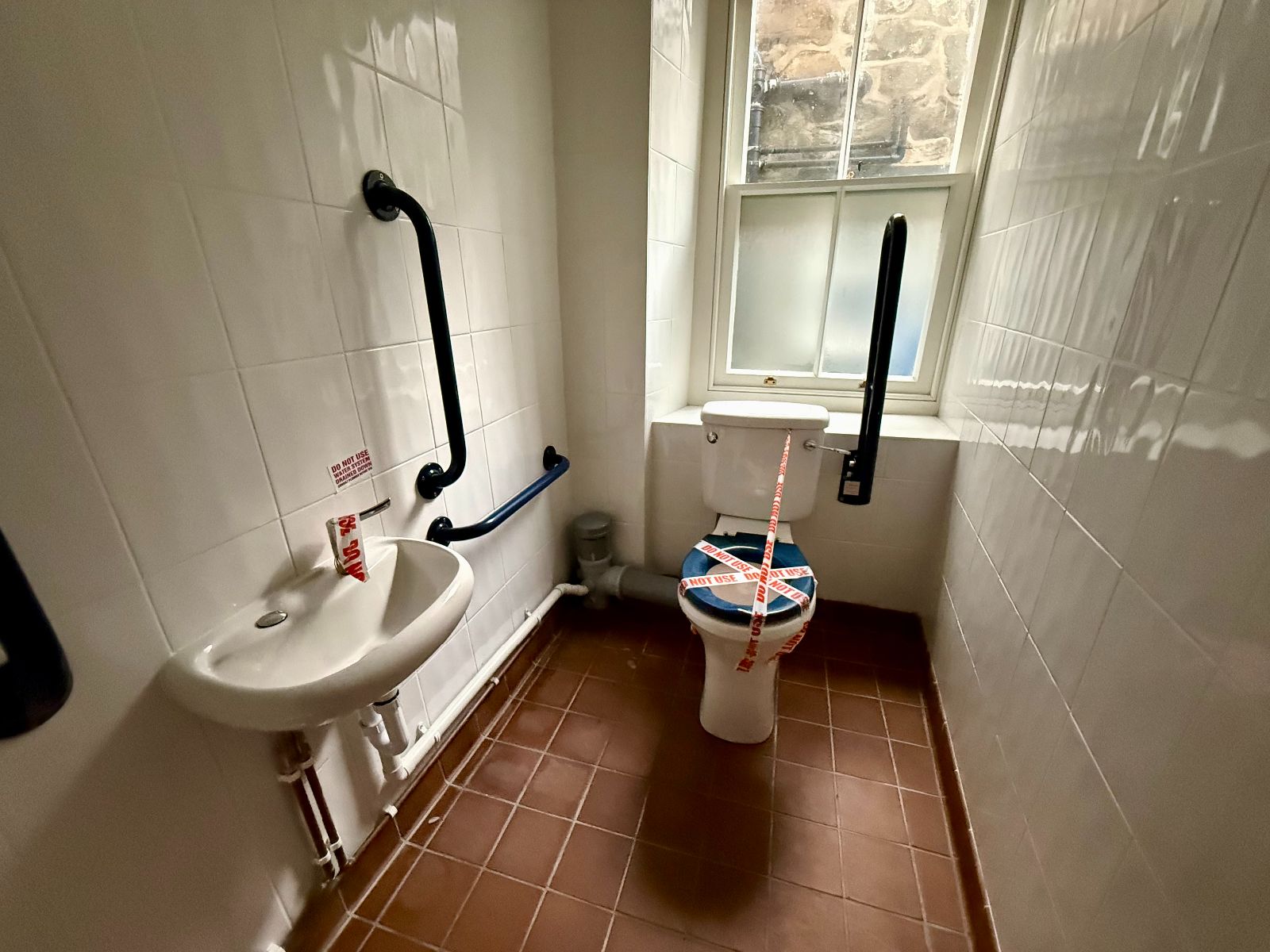 Window to side, low level WC, wash hand basin, quarry tiled flooring.