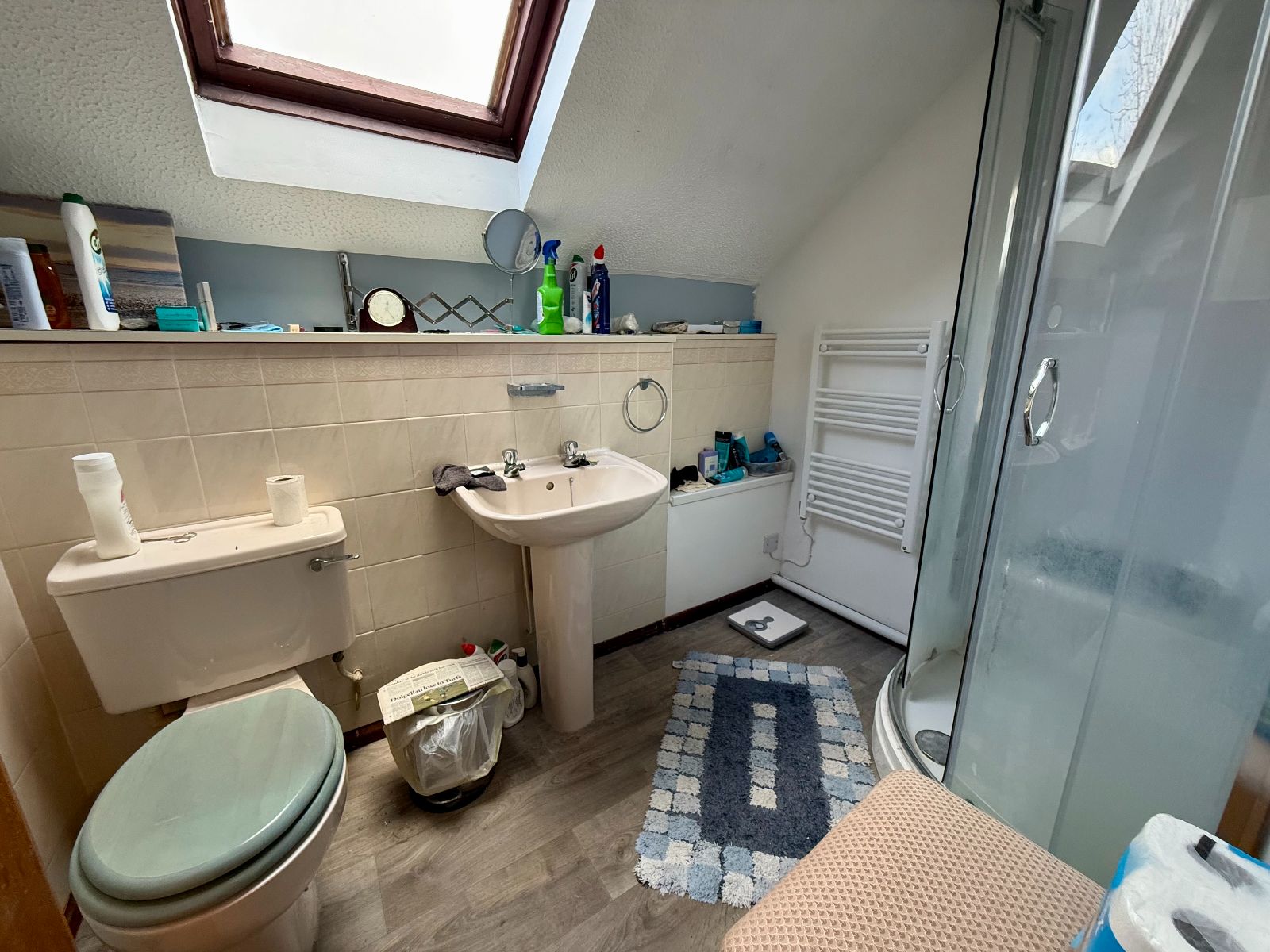 Velux to rear, partly tiled walls, low level W.C., pedestal wash hand basin, shower cubicle with electric shower, heated towel rail/radiator, cushion floor.