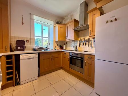 Window to rear, 9 wall units, 8 base units under a granite effect worktop, storage cupboard, 1 1/4 stainless steel sink and drainer, cupboard housing Vaillant combi boiler, tiled splash back, integral oven, 4 ring ceramic hob and extractor hood above, space for a fridge freezer, space for a washing machine, space a dish washer, porcelain tiled floor.