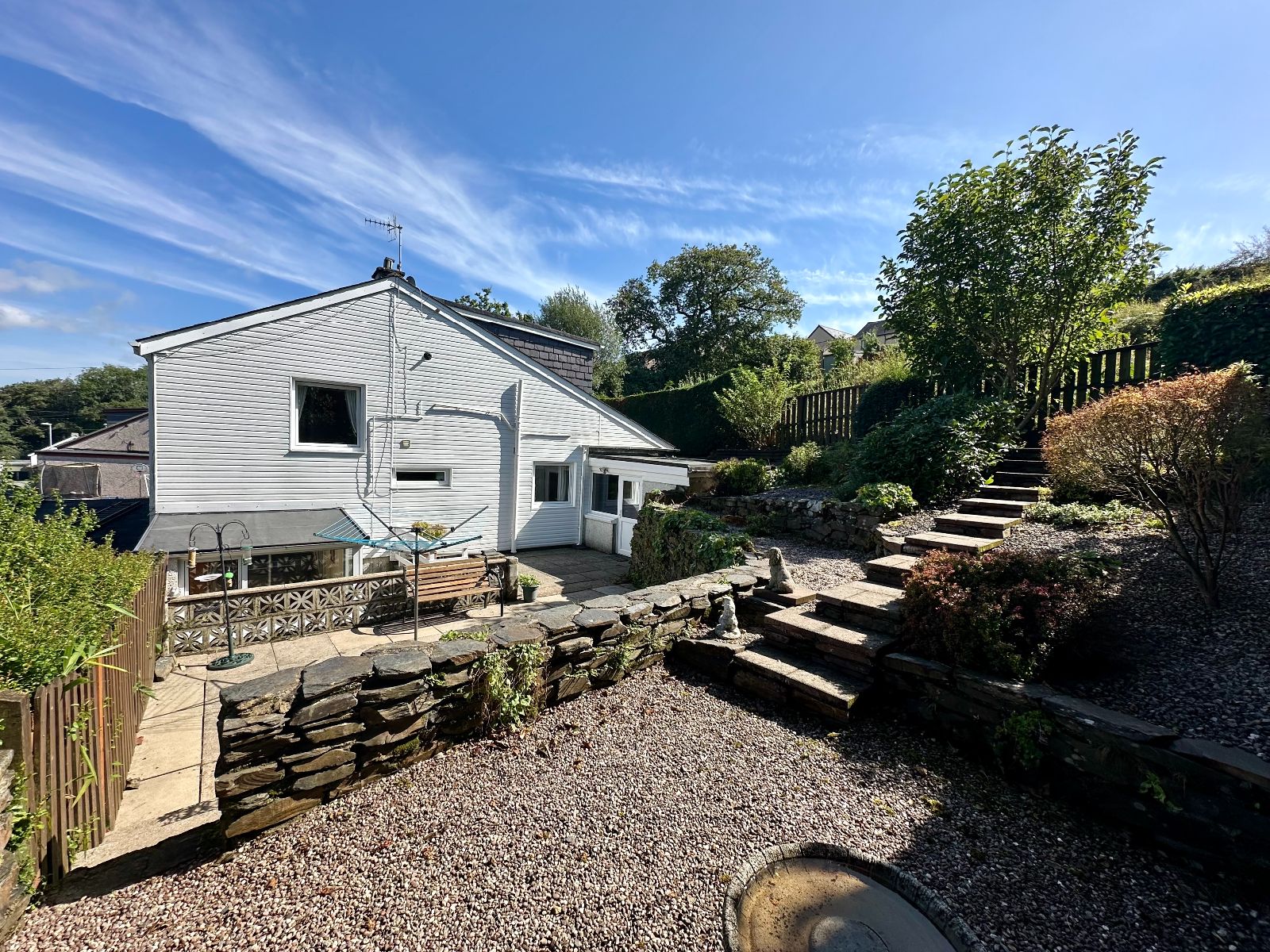Terraced Garden to rear; paved patio seating area with steps down to sun room.