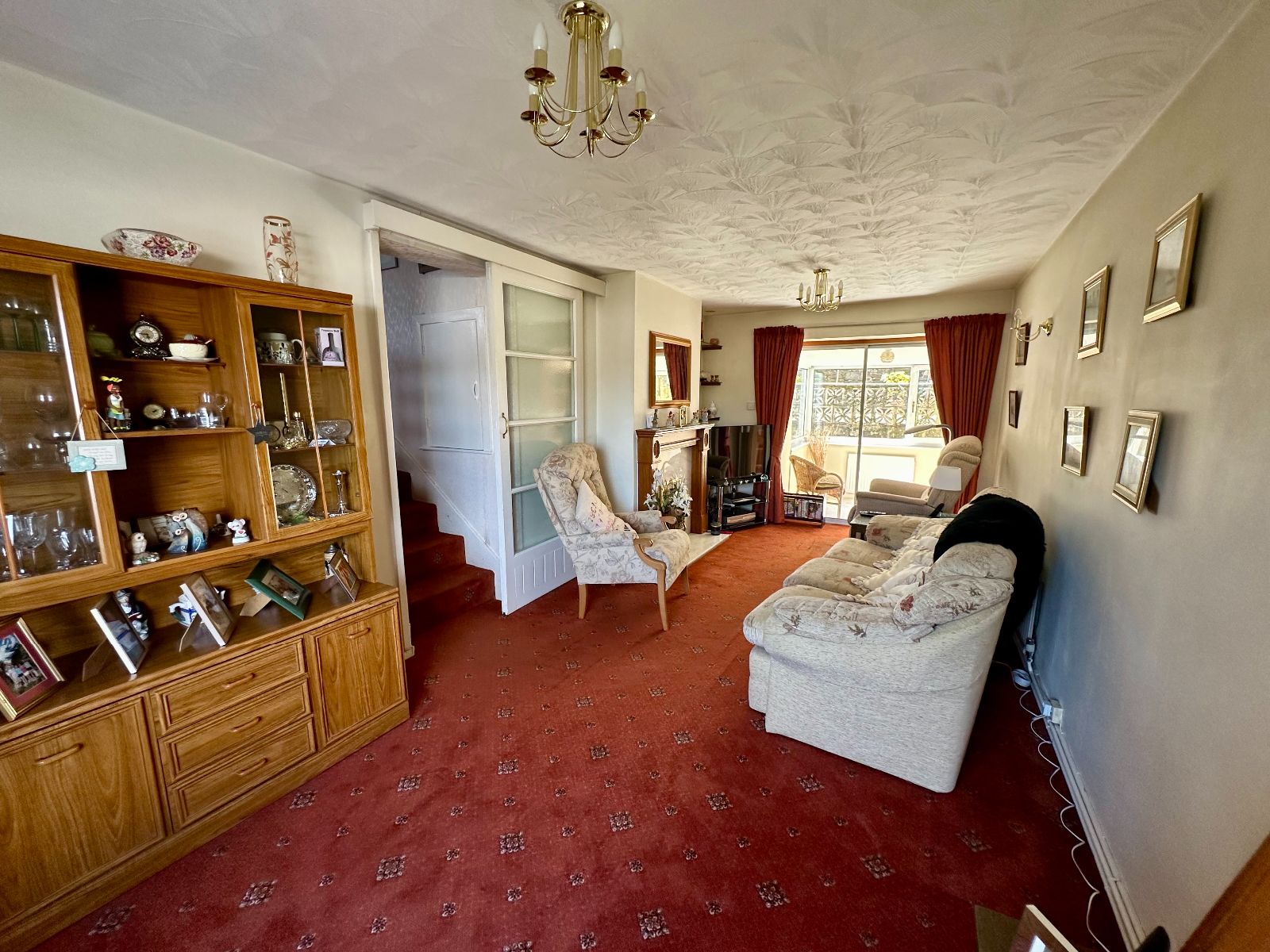 Window to front with far distant countryside views, patio doors to rear leading into sun room, feature fireplace with wood surround housing a gas fire, 2 radiators, carpet