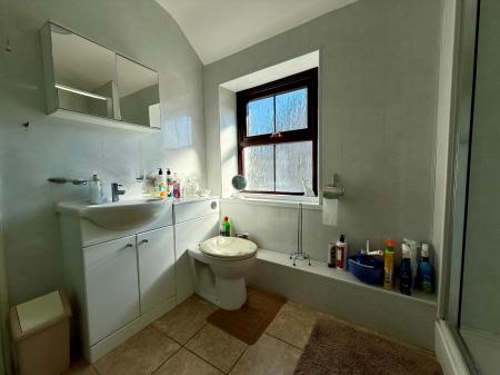 Window to rear, vanitory wash hand basin and low level WC, fully panelled walls, large shower cubicle with electric shower, heated towel rail/radiator, airing cupboard housing hot water tank, tiled flooring.
