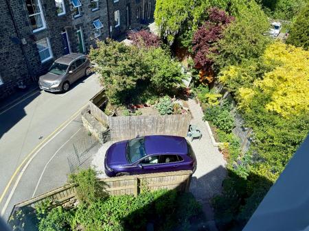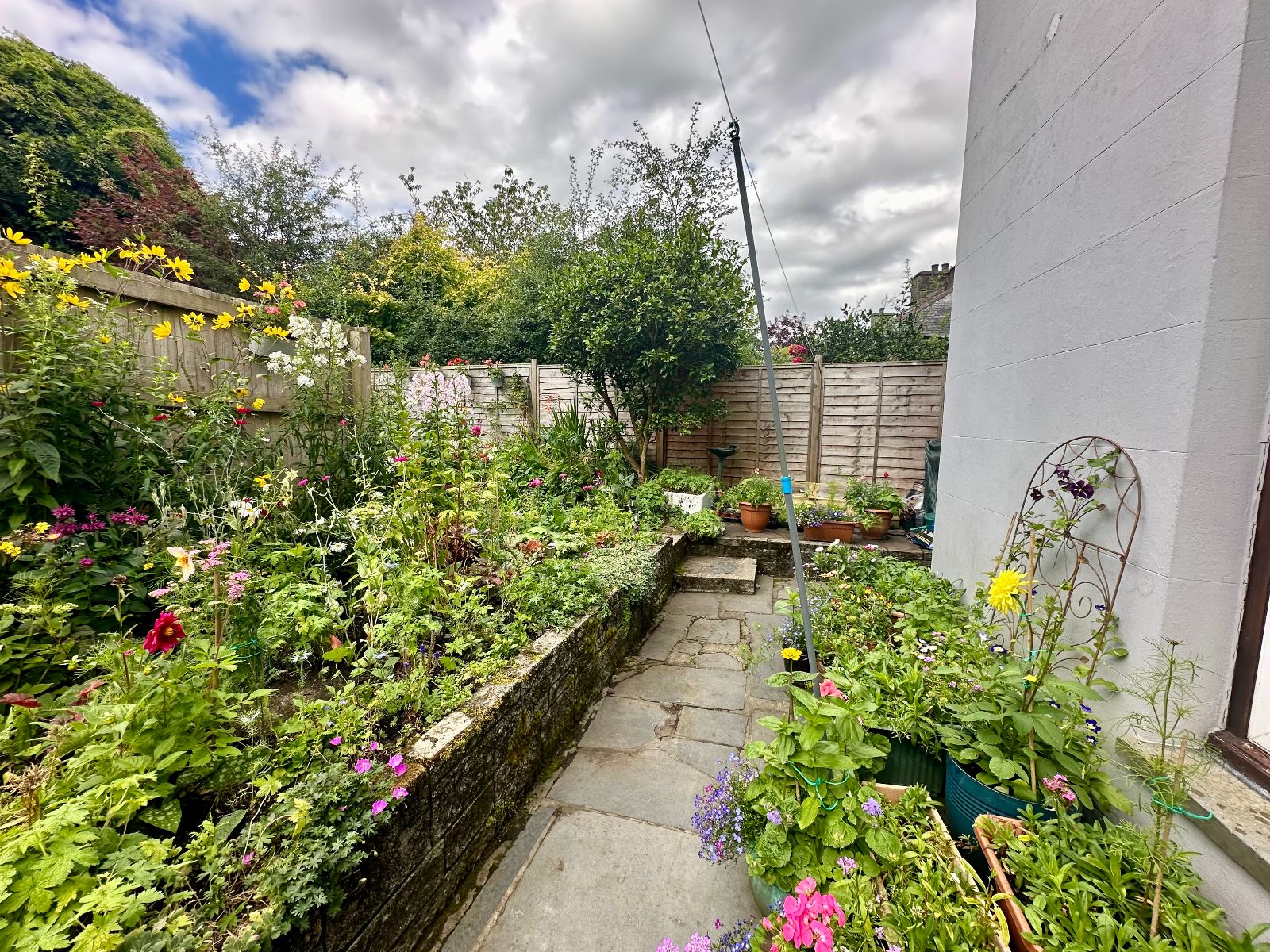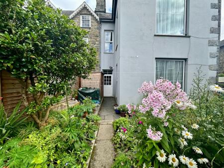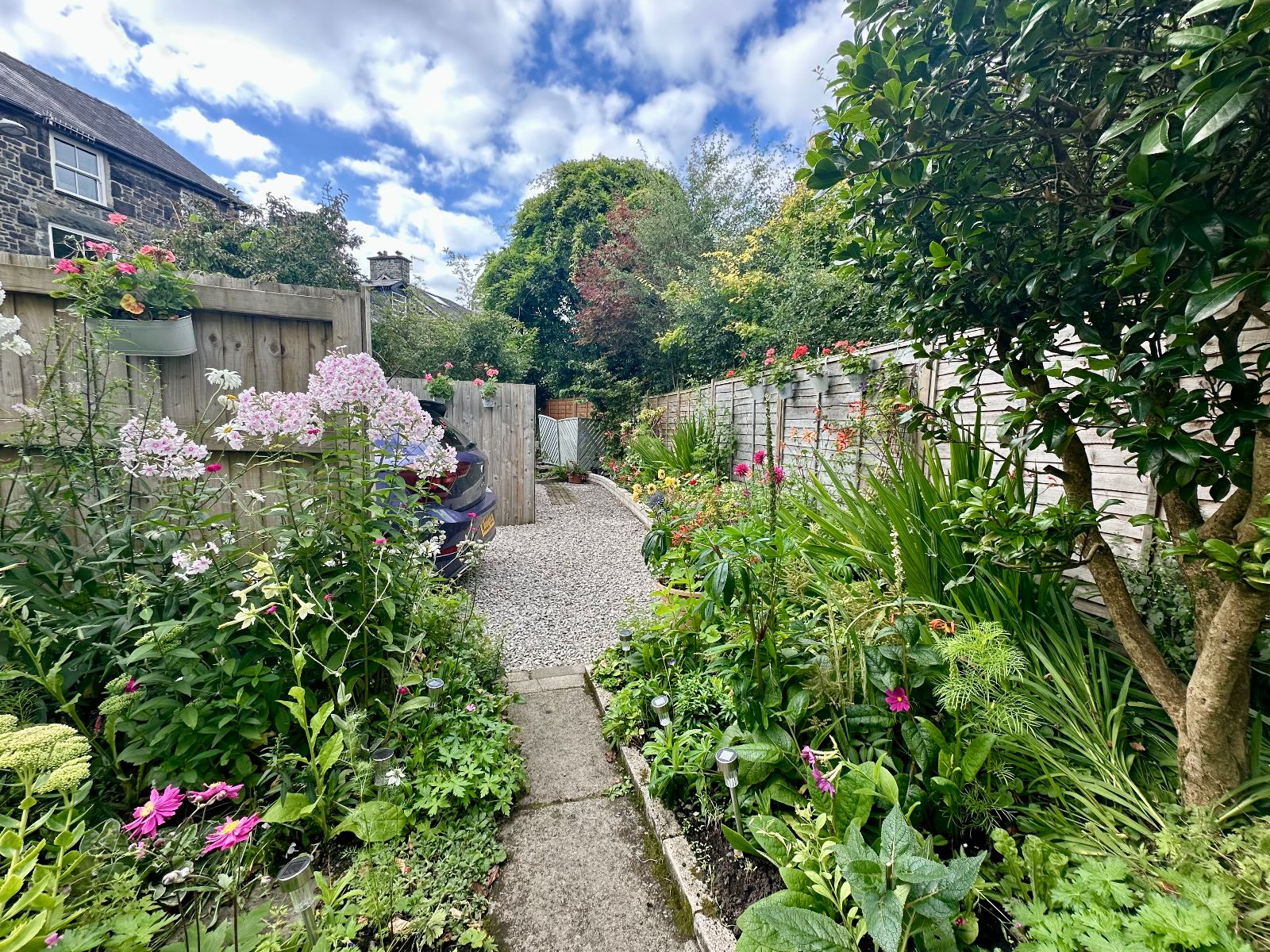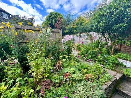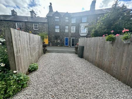 To the side: Two garden areas. The first accessible from the utility area, slate pathway with planted raised beds and shed, leading to gravelled area providing off road parking for 2 vehicles. From the parking area, a gravelled pathway leads to a further garden area with raised vegetable plots, planted borders with a variety of mature shrubs and trees. The garden is enclosed with low stone wall with fence panelling, with steps leading down to a wrought iron gateway leading back onto the road.