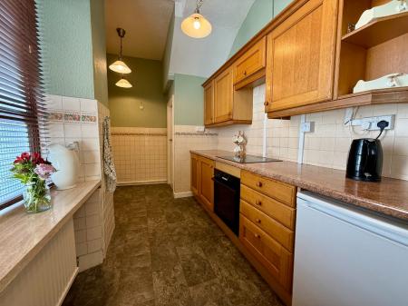 Window to side, 8 wall units, 4 base units under granite effect worktop, tiled splash back, integral oven with 4 ring induction hob, Belfast sink with granite drainer, space for dishwasher, radiator, cushion flooring.