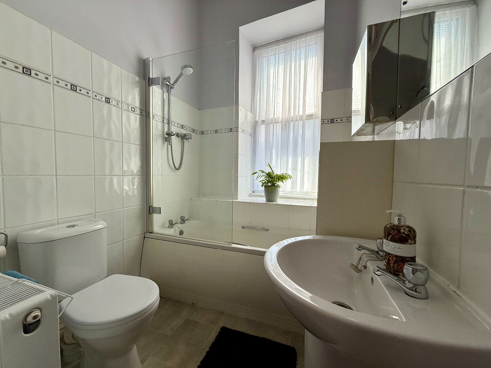 Window to front, panelled bath with tiled splashback, mains shower and shower screen, low level W.C., pedestal wash hand basin mirror over with shaving socket and light, under stairs storage, radiator, cushion flooring.
