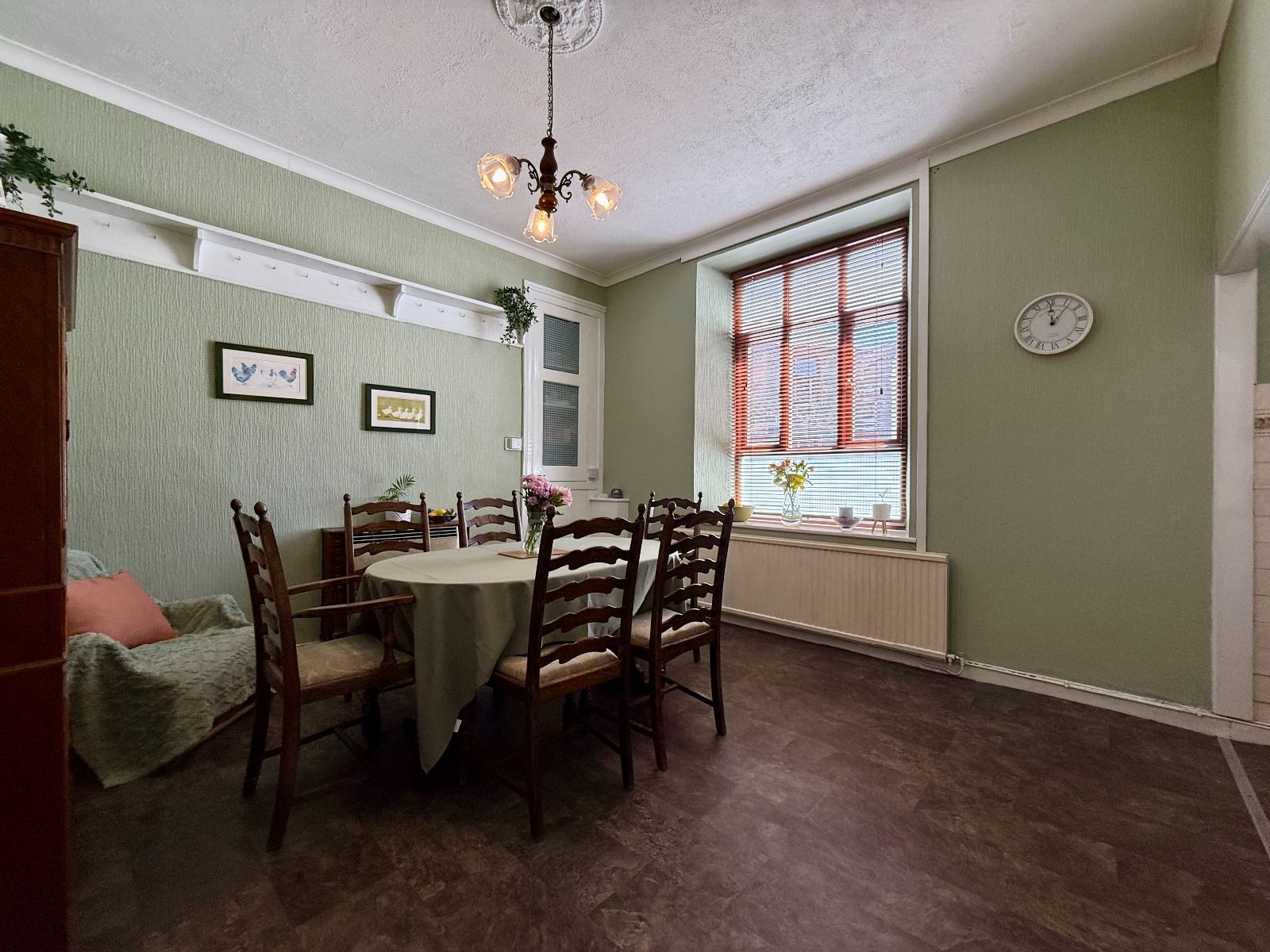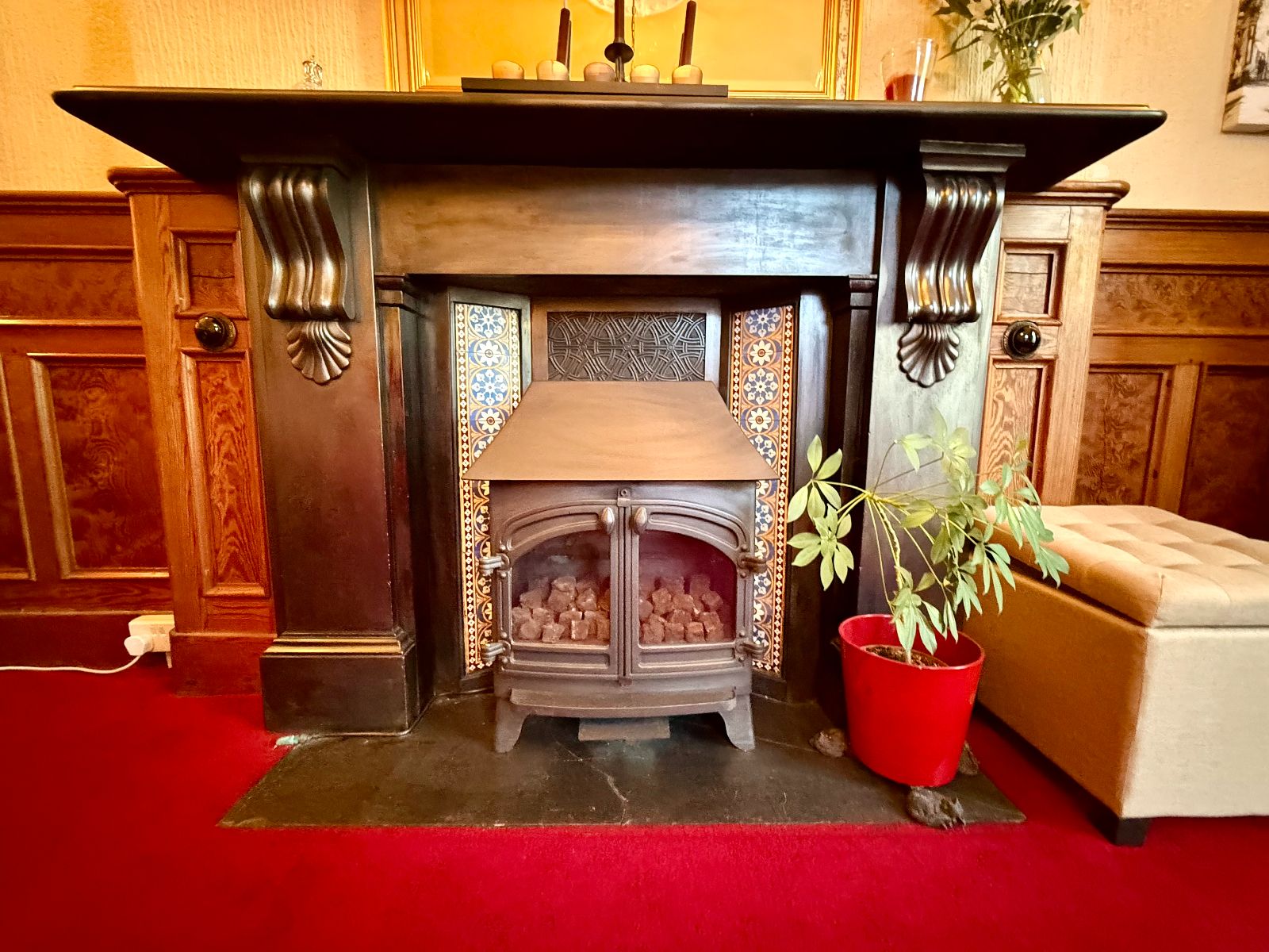 Window to side, window to rear with pitch pine panelling, coved ceiling, ceiling rose, wall lights, decorative pitch pine panelling to dado height, slate feature fireplace with tiled inset, slate hearth housing a coal flame effect, gas wood burning stove, radiator, carpet.