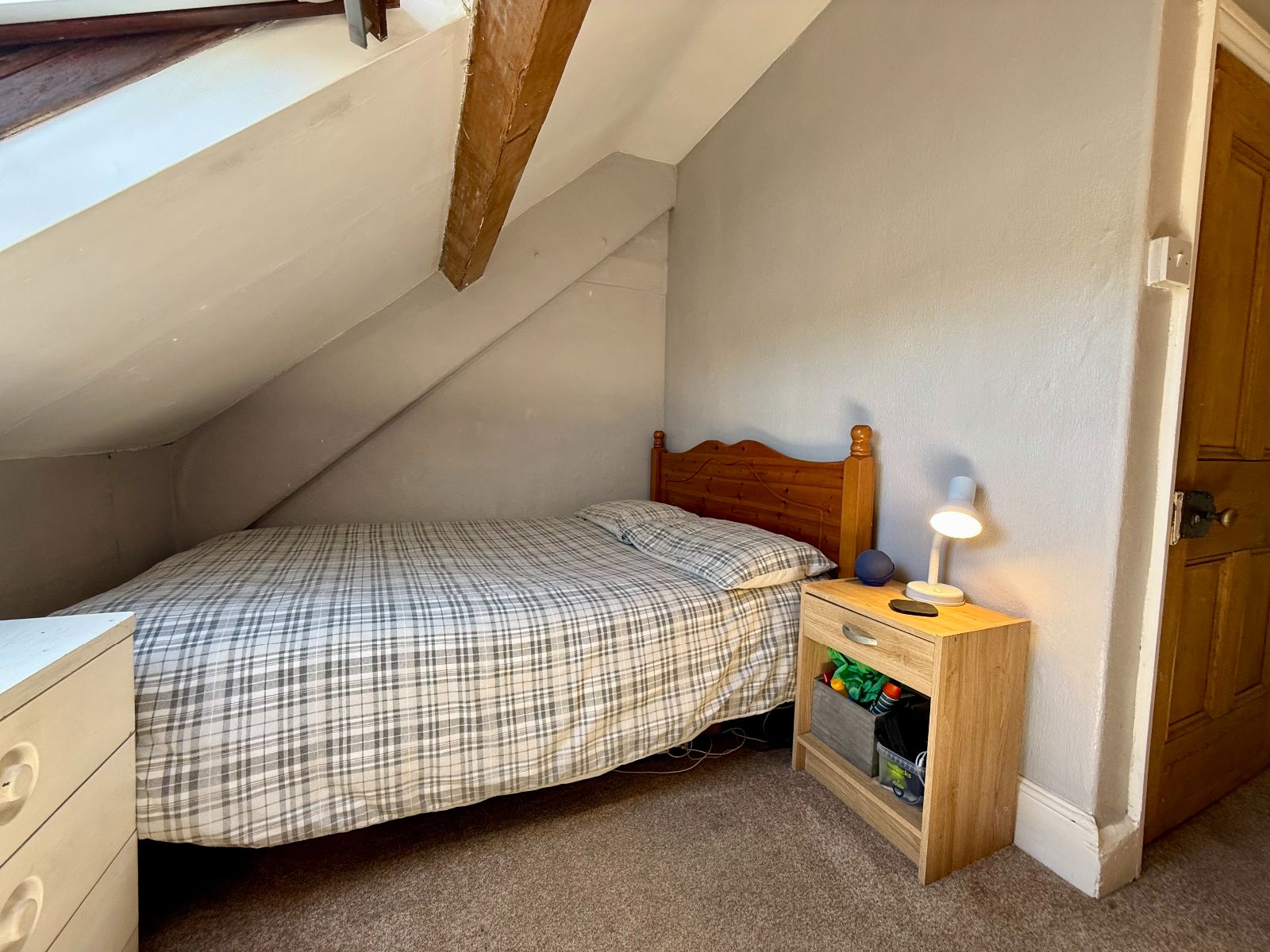 Velux to side, exposed beams, wall light, door into attic storage area with cold water tank, carpet.