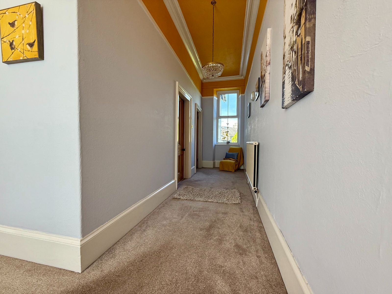Window to front, window to both sides, coved ceiling, picture rail, built-in shelving, 2 radiators, carpet. Staircase leading to second floor landing.