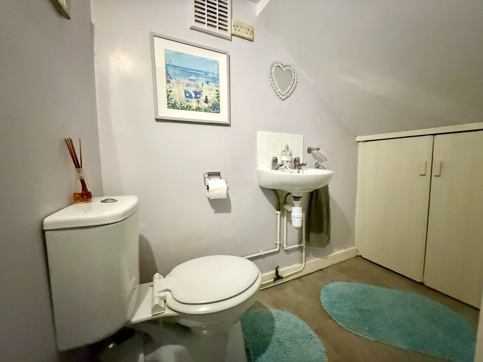 Low level W.C., wash hand basin, tiled splashback, under stairs cupboard, cushion floor.