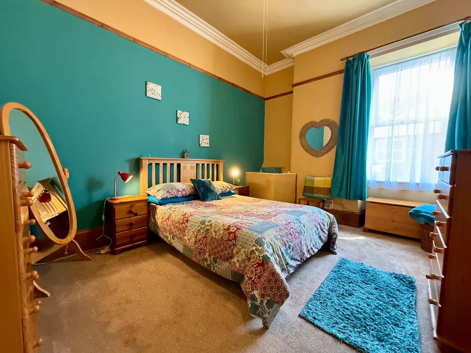 Window to side, window to rear with original pitch pine panelling, coved ceiling, ceiling rose, picture rail, 2 built-in double wardrobes, radiator, exposed floorboards.