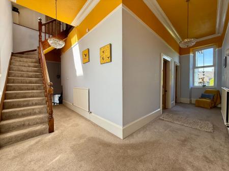 Door to front, coved ceiling, picture rail, staircase to first floor, radiator, original Minton tiled flooring.