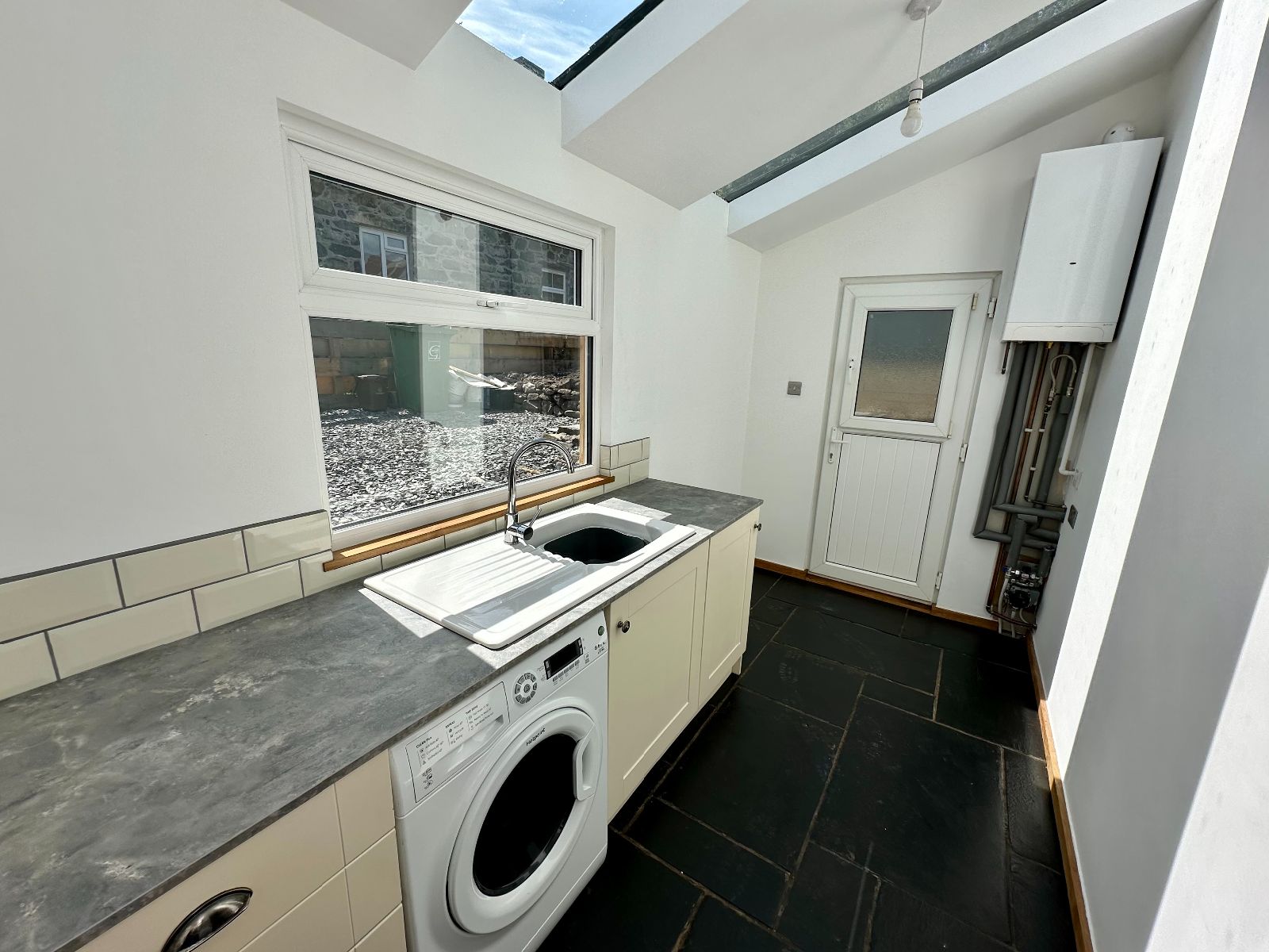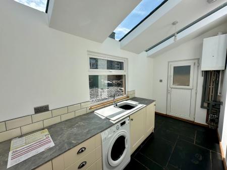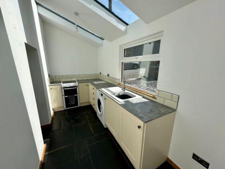 Stable door to rear, window to side, 3 large skylights, 6 base units under a granite effect worktop, ceramic sink and drainer, tiled splashback, space for electric cooker, space for fridge freezer, plumbing for an automatic washing machine Biasi combi boiler, slate flagged flooring.