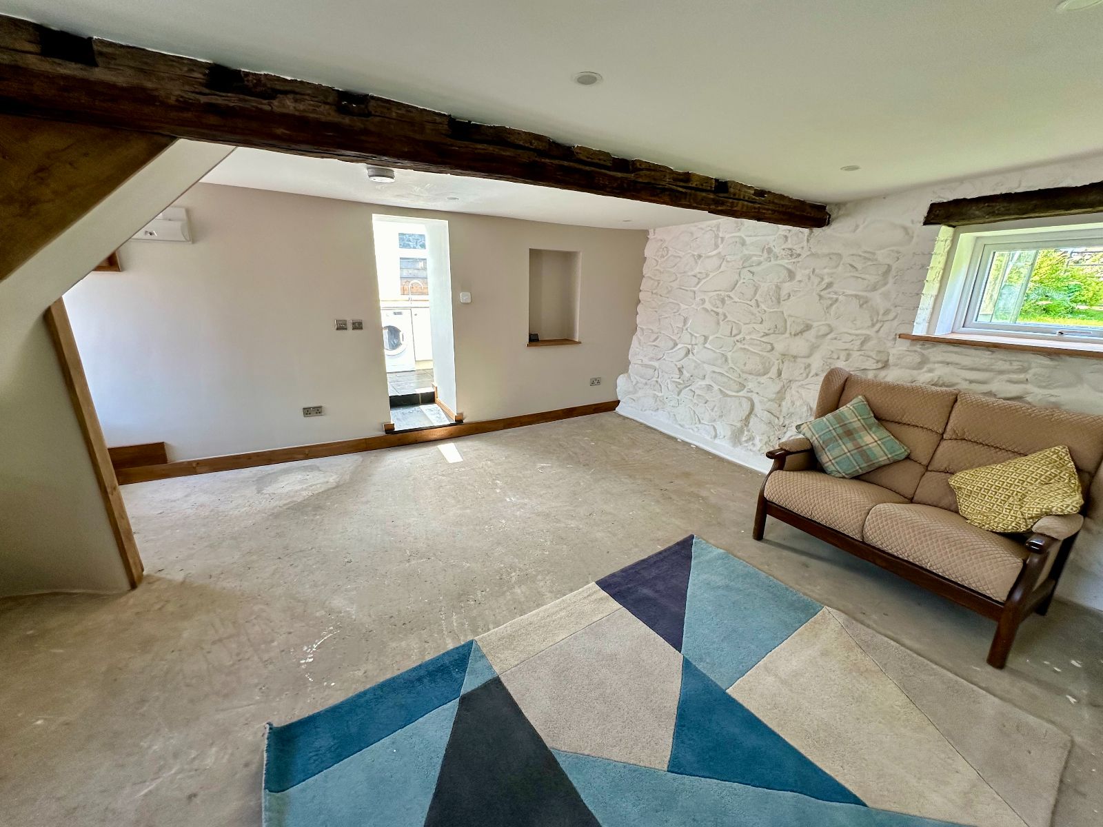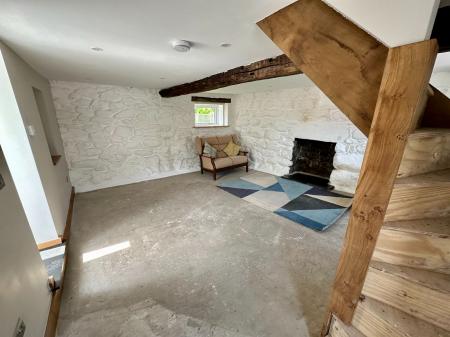 Two windows to front, window to rear, ceiling downlights, part exposed painted stone walls, fireplace with ornamental slate hearth, stairs to first floor, concrete flooring.