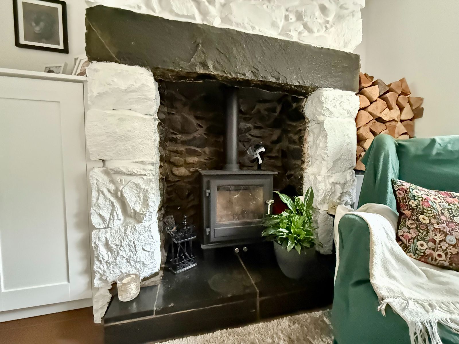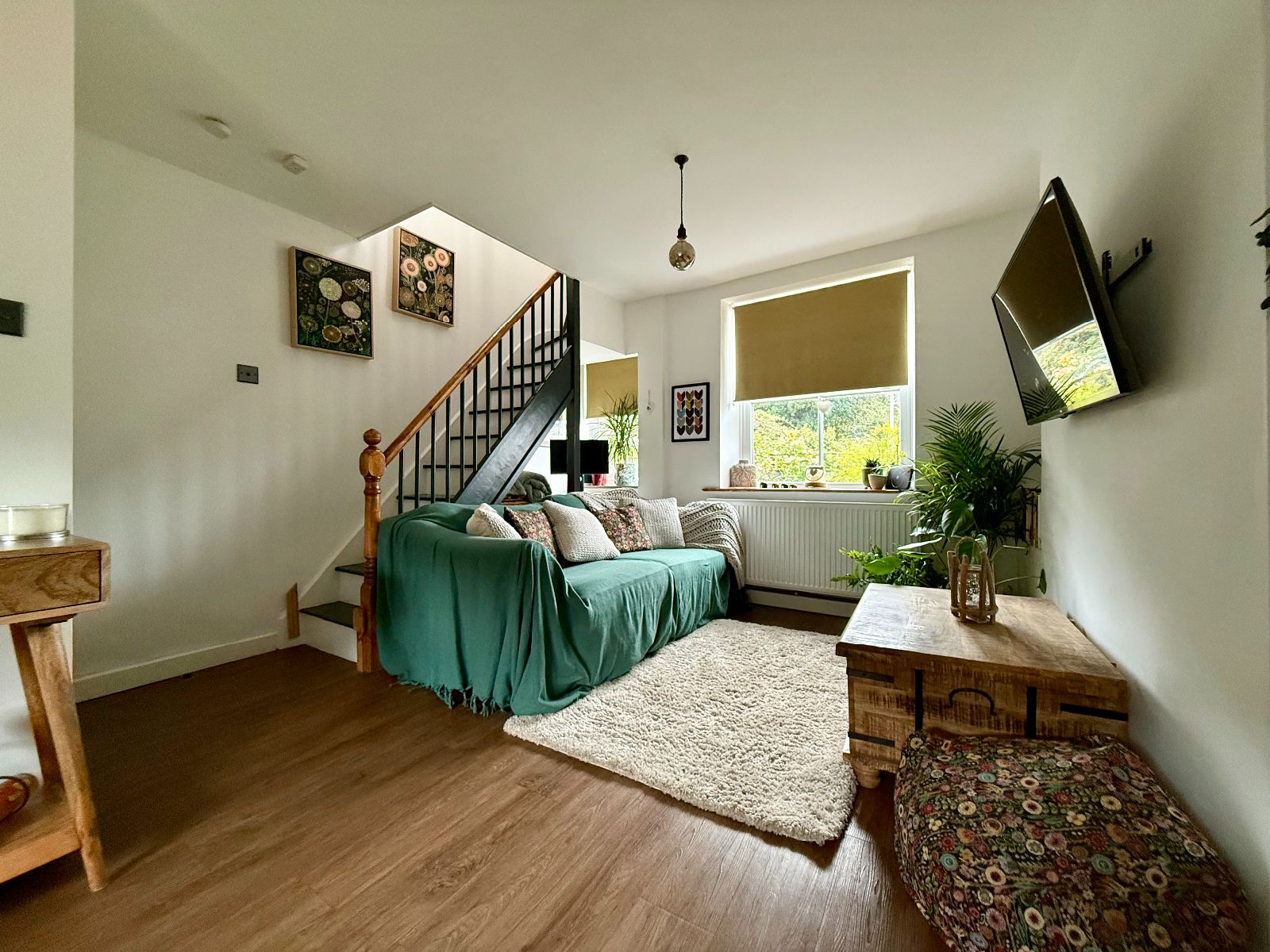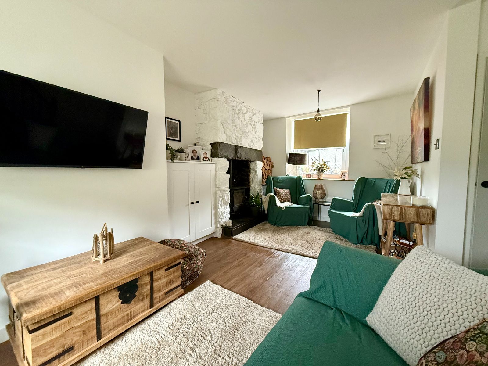 Window to front, 2 windows to rear, stairs to first floor, stone fireplace with slate hearth, built in storage cupboard, radiator, laminate flooring.
