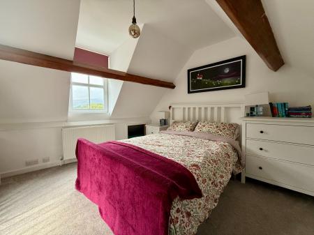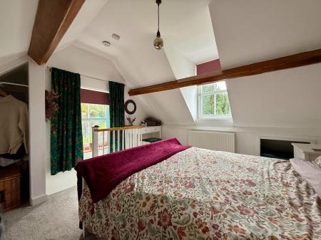 Stairs from landing, exposed beams, window to side and window to rear with distant countryside views, eaves storage, radiator, carpet.