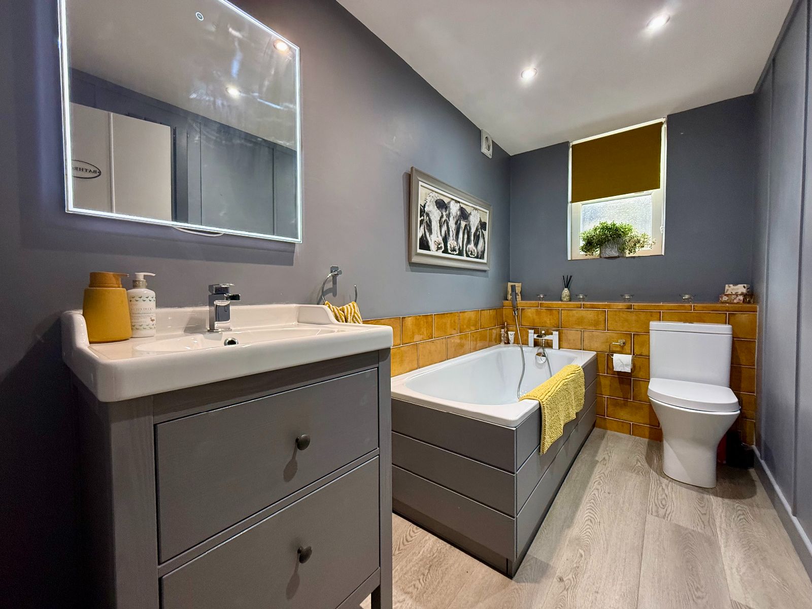 Window to side, ceiling downlights, extractor fan, low level WC, wash hand basin vanity unit, LED mirror above, panelled bath with handheld shower attachment, part tiled walls, tower radiator, laminate flooring.