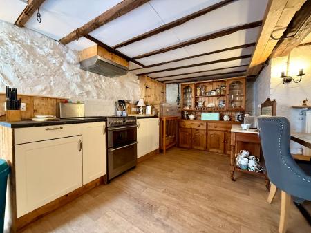 Original slate steps down to kitchen/breakfast room, window to rear, door to rear leading to rear garden area, exposed beams, wall lights, 6 base units under a marble effect worktop, 1 1/4 stainless sink and drainer, space for washing machine, space for electric/gas cooker, with extractor hood above, space for fridge/freezer, built in cupboard, built in cupboard housing Vaillant combi boiler, 2 x radiator, cushion flooring.