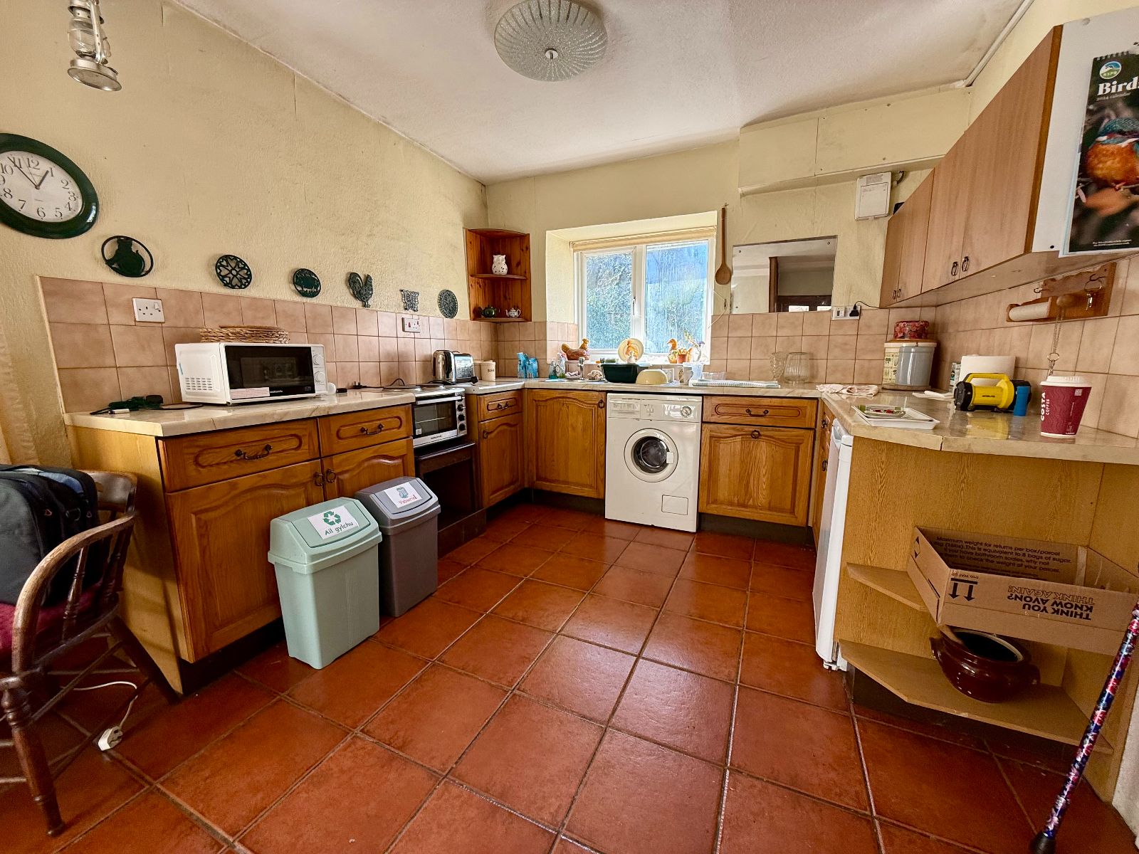 Door and window to side, window to rear, 4 wall units, 6 base units under a marble effect worktop, tiled splash back, stainless steel sink and drainer, space for a cooker, space for a washing machine, space for a fridge, radiator, tiled flooring.