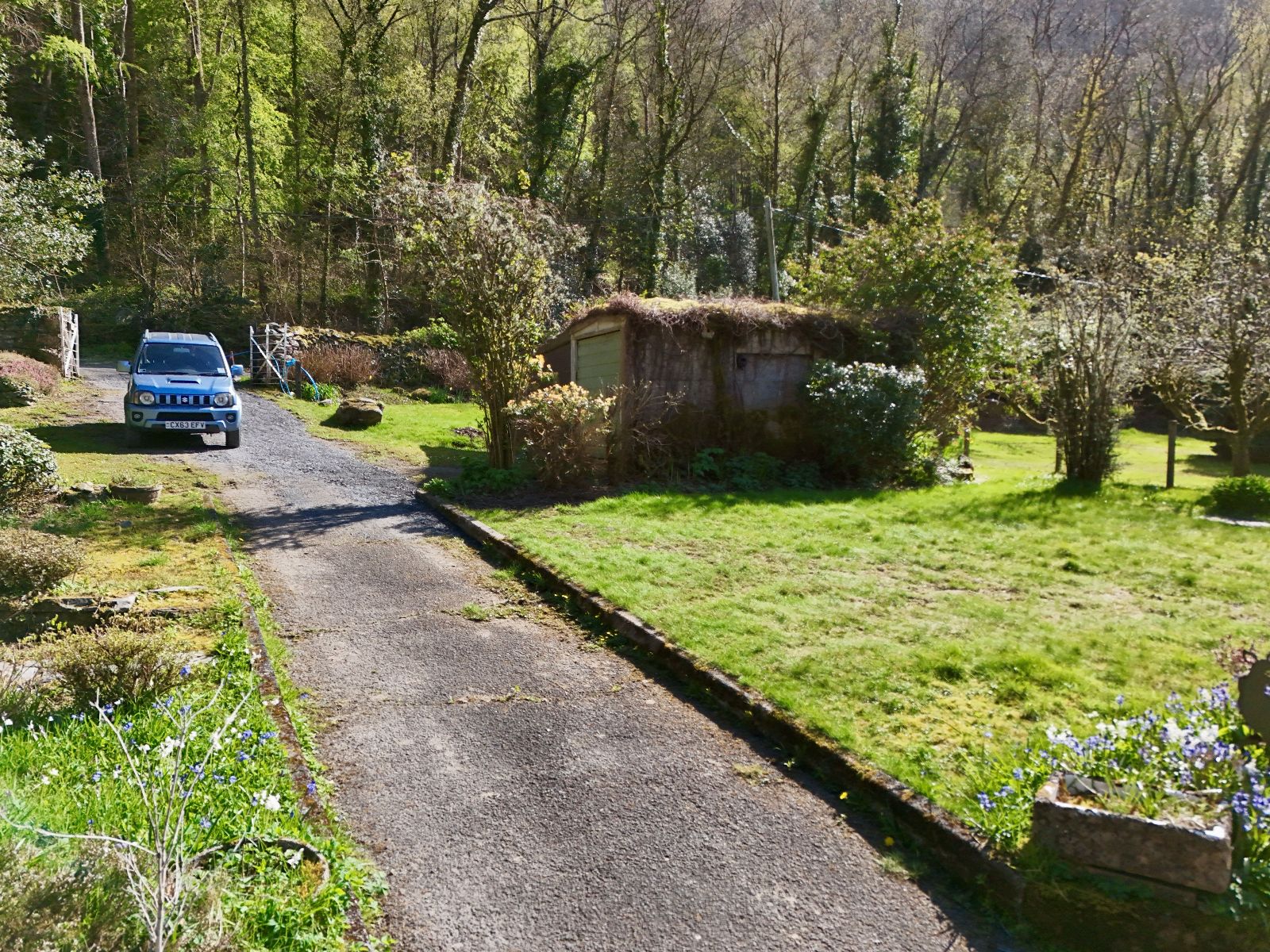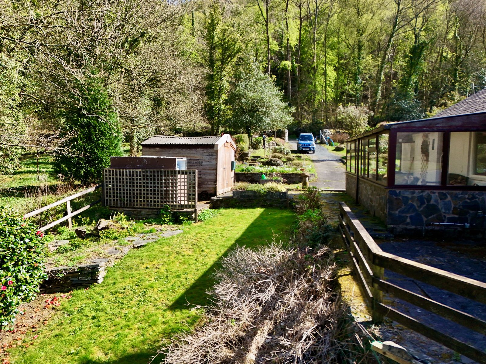 Front and rear patios, with additional lawn areas to the front, side, and rear. The garden features mature trees and shrubs, a raised patio at the front, and a sloping lawn leading to steps and a gated access point. There is also a driveway at the rear providing ample off-road parking.