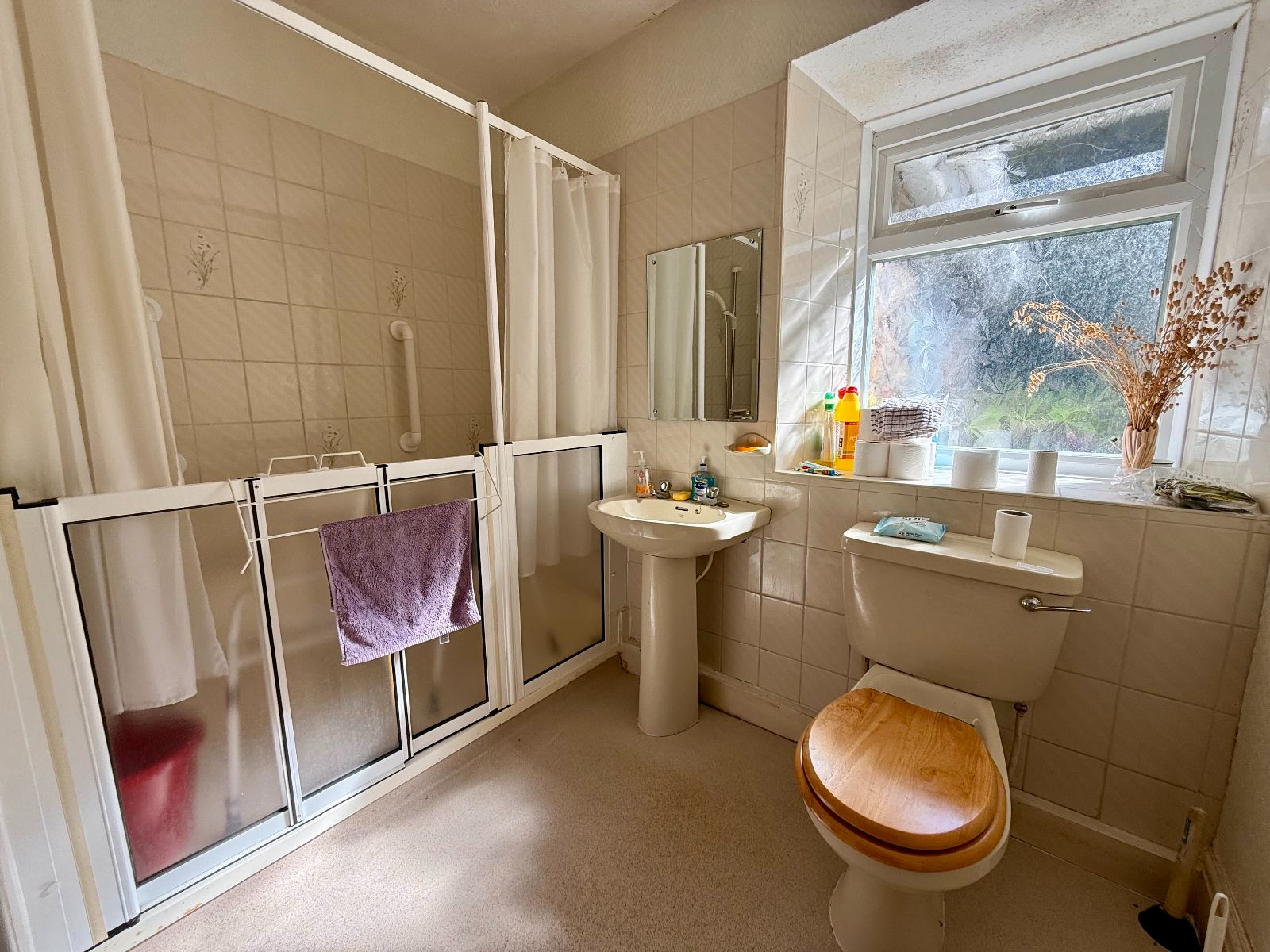 Window to rear, fully tiled walk in shower, electric shower, pedestal wash hand basin, low level WC, airing cupboard, radiator, non slip floor.