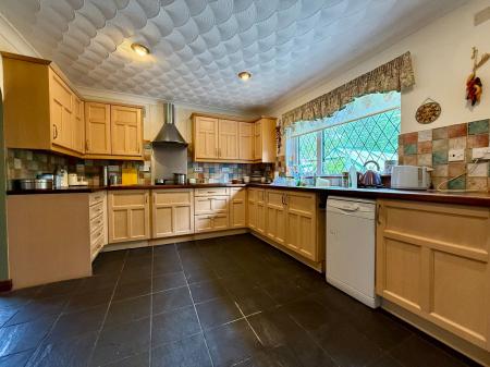 Window and door to rear, 10 base units, 10 wall units under a timber effect worktop, 1 1/4 stainless steel sink and drainer, electric hob with extractor hood over, space for a dishwasher and a fridge freezer, tiled splashback, tiled flooring.