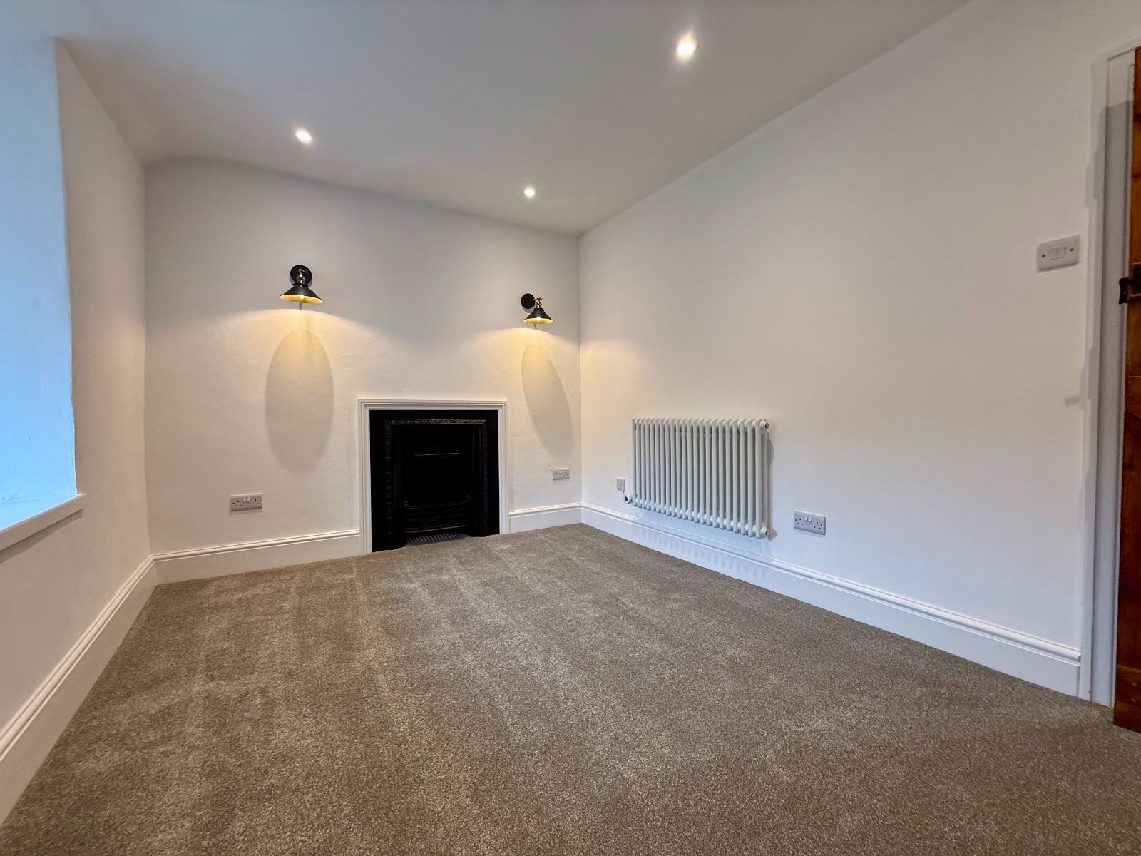 Window to front, ceiling down lights, part exposed A frame, radiator, carpet.