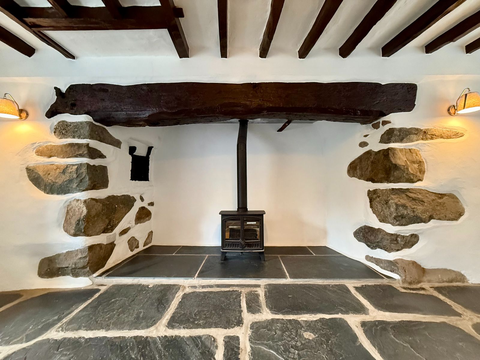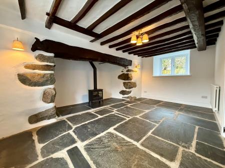 Window to front, and rear, exposed beams, large inglenook fireplace with original bread oven and part exposed stone, housing a multifuel stove on a slate hearth, wall lights, radiator, slate flagged floor.