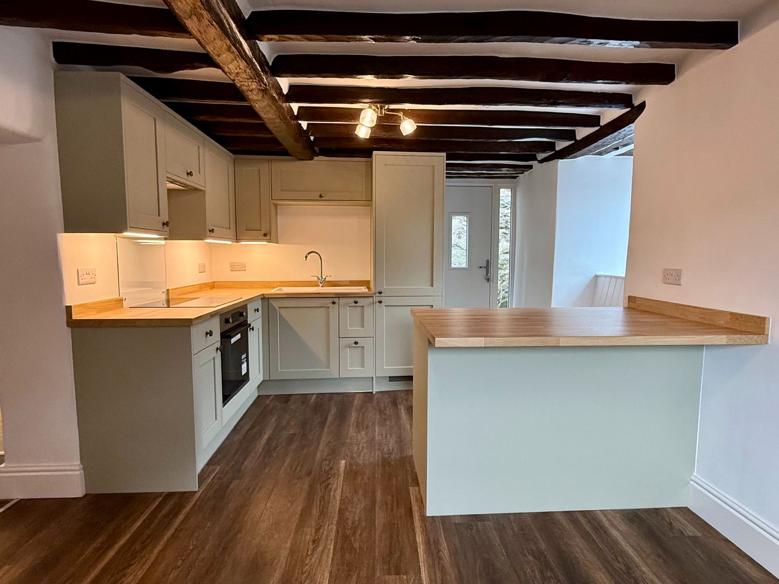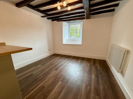 Window to front, window to side with window seat, door to rear, exposed beams, modern fitted shaker style kitchen, 4 wall units, 4 base units under a butcher block style worktop, composite sink and drainer, integral single oven, 4 ring ceramic hob with glass splash back and extractor hood over, 3 base units under a butcher block worktop breakfast bar, radiator, laminate floor.
