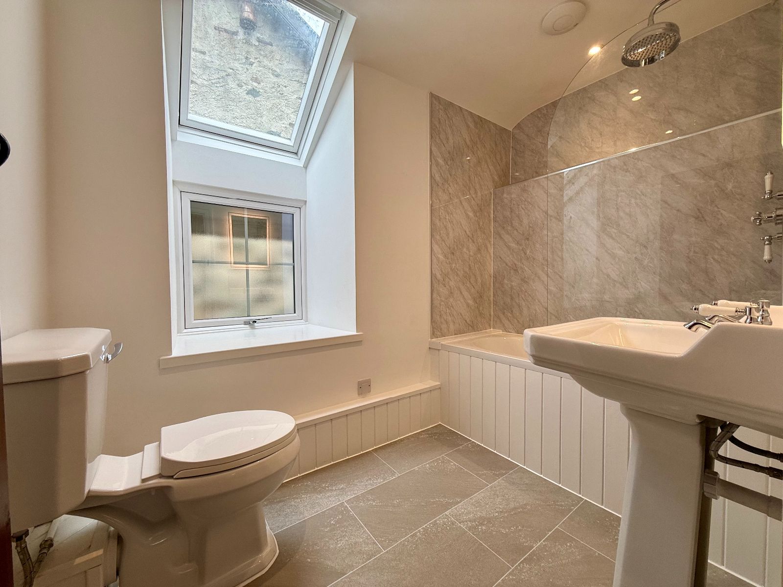 Window and Velux to rear, ceiling down lights, panelled bath with mains shower above and shower screen, wet wall panelling, low level WC, pedestal wash hand basin with splashback, LED illuminated mirror, cushion flooring.