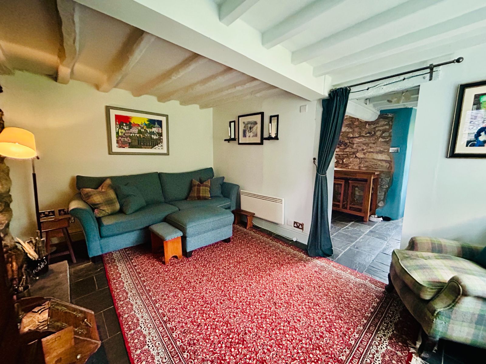 Window to side over looking the garden, exposed beams, exposed stone open fireplace with slate hearth, electric panel heater, slate tiled flooring.
