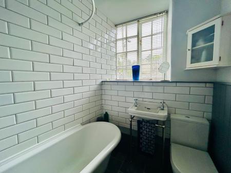 Window to front, mainly tiled walls, roll top bath with mixer shower attachment, mains shower, wash hand basin, low level WC, corner wall unit, part tongue and groove walls to dado height, heated towel rail radiator, tiled flooring.