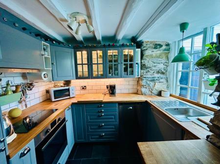 Door and window to rear, exposed beams, exposed stone wall, modern fitted kitchen to include: 6 wall units with downlights, 5 base units with timber worktop, tiled splashback, integral oven with 2 ring ceramic hob and extractor fan above, integral fridge freezer and dishwasher, stainless steel sink and drainer, understairs storage, electric panel heater, slate tiled flooring.