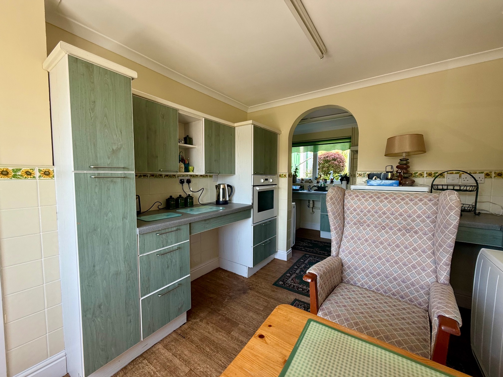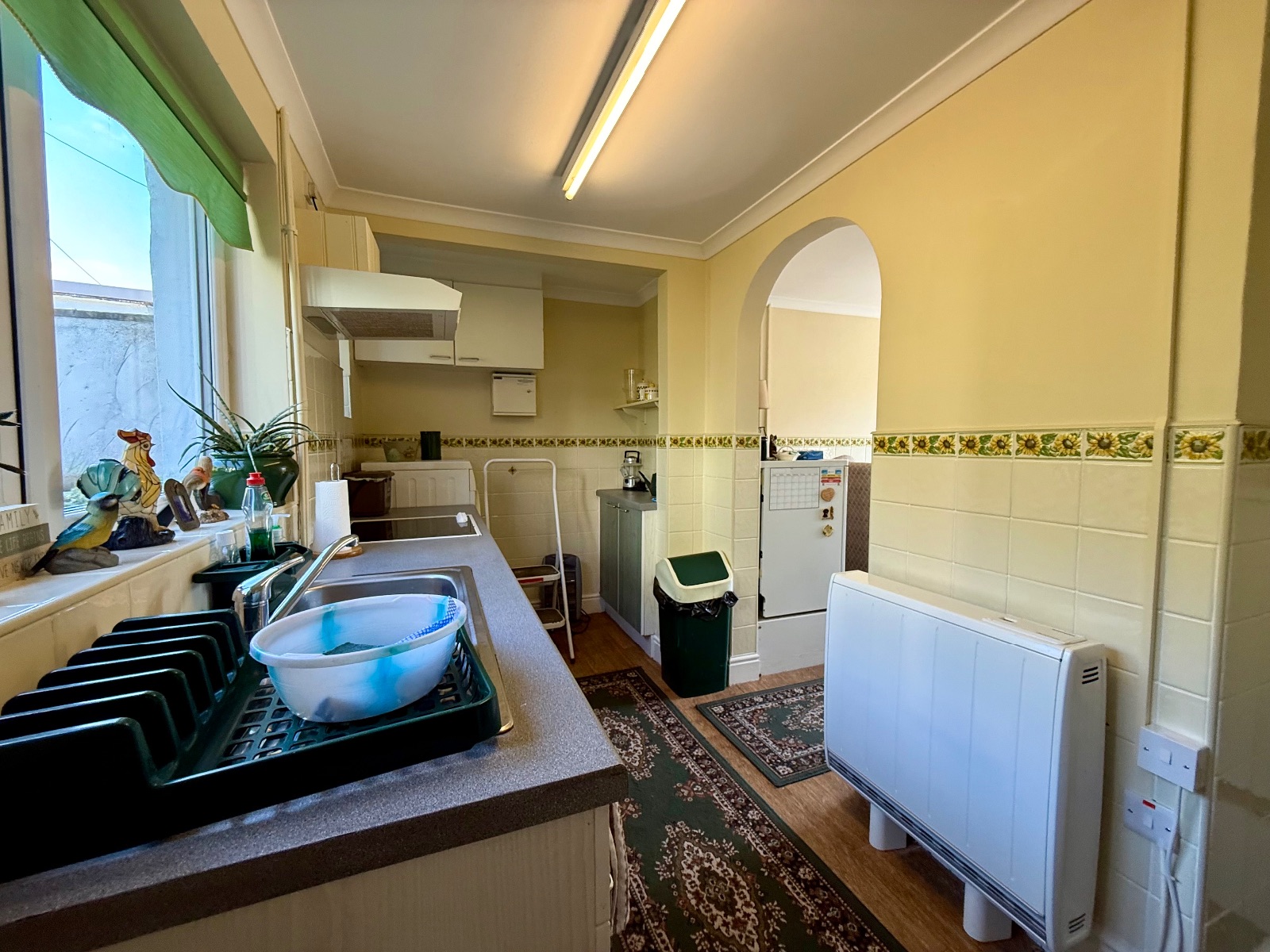 Door to rear, 2 windows to rear, worktops with stainless steel sink and drainer, ceramic hob, space for washing machine, space for fridge/freezer, electric storage heater, laminate flooring.