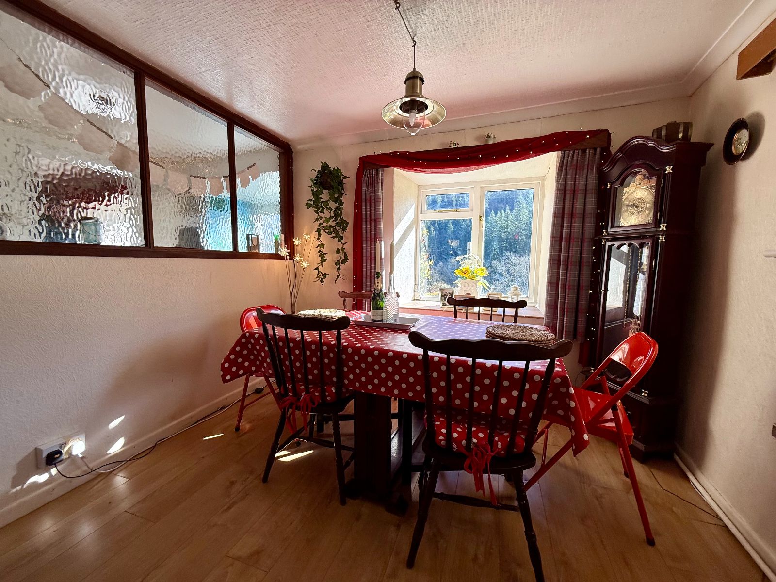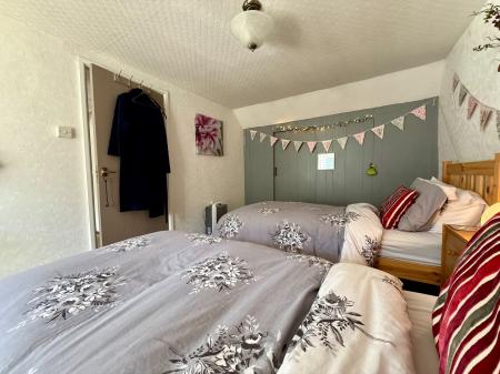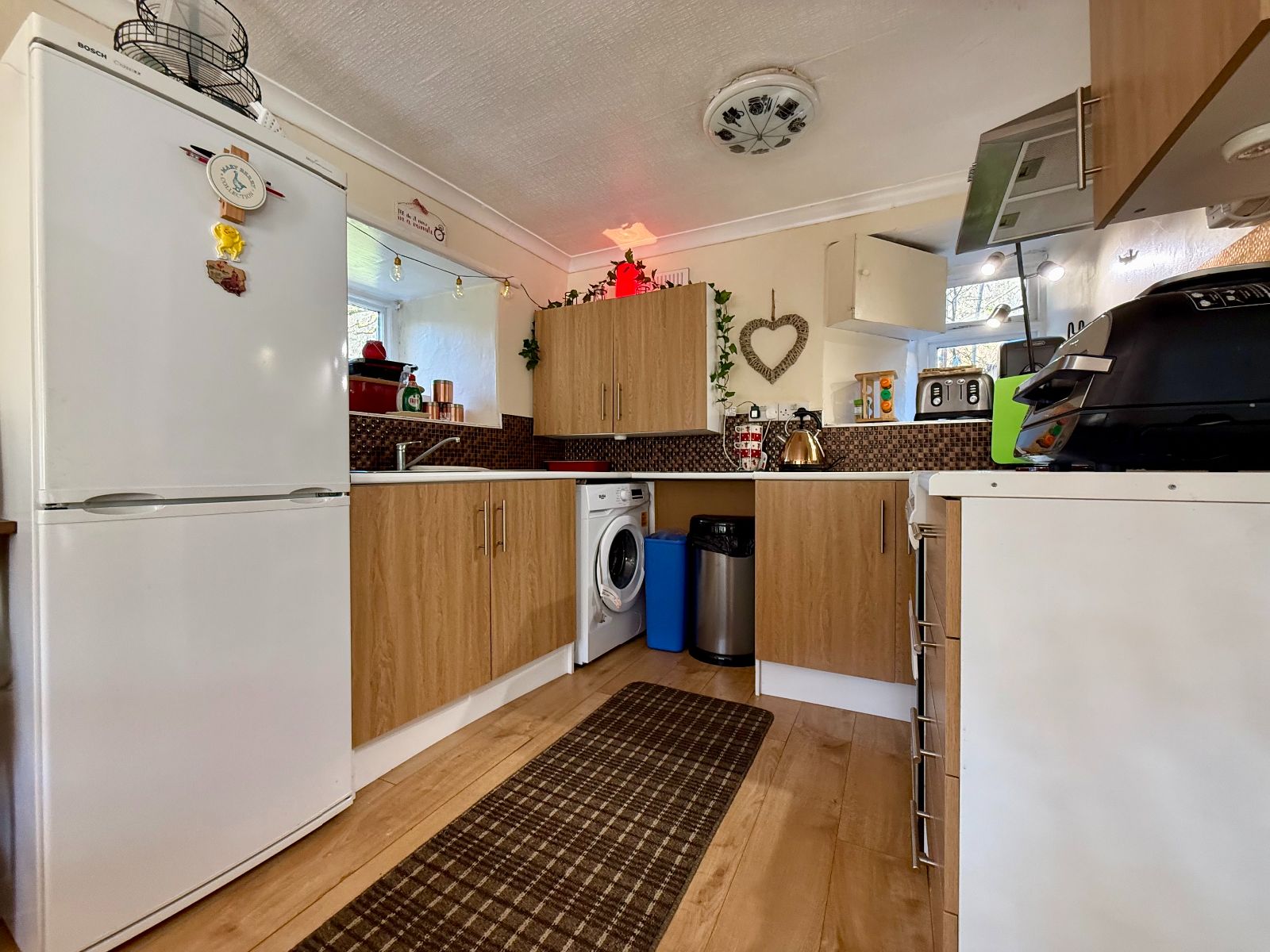 Window to front with forestry views, window to rear, coved ceiling, 2 windows to side, 3 wall units, 5 base units under worktop, stainless steel sink and drainer, space for electric cooker, space for a washing machine, space for a fridge freezer, tiled splash back, stainless steel extractor hood, radiator, laminate flooring.