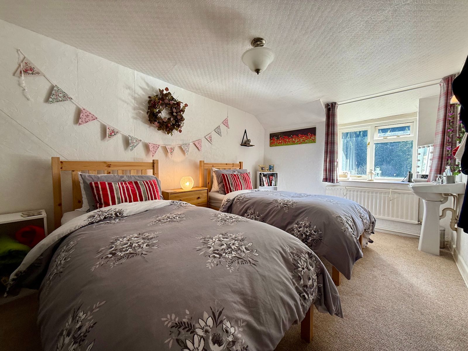 Window to front with forestry views, built in wardrobes with sliding doors, radiator, pedestal wash hand basin, shaver socket and light over, carpet.