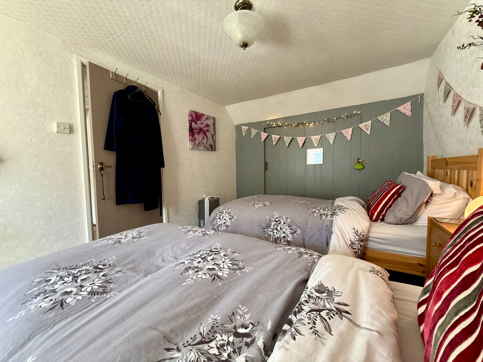 Front enclosed garden featuring a lawn and shrubs, bordered by a picket fence. To the side, there is an outbuilding housing the boiler.