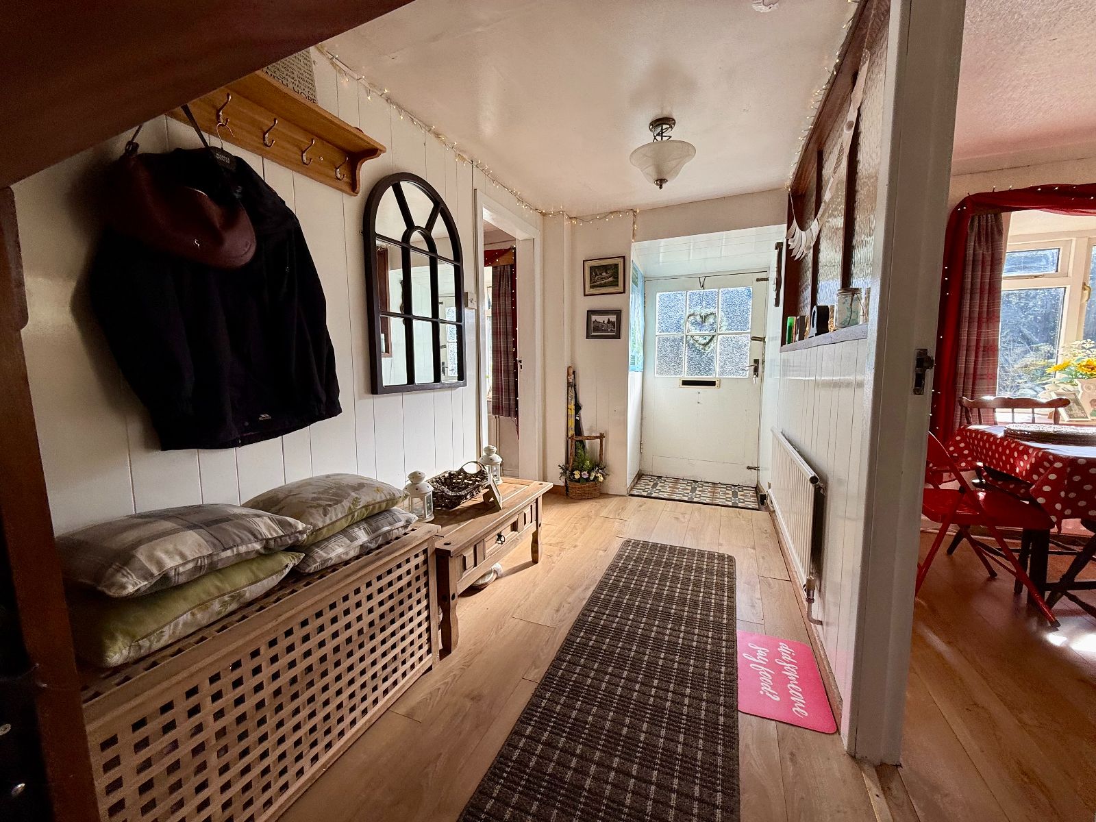 Door to front and rear, stairs to first floor, tongue and groove panelled walls, radiator, internal window to kitchen, laminate flooring.