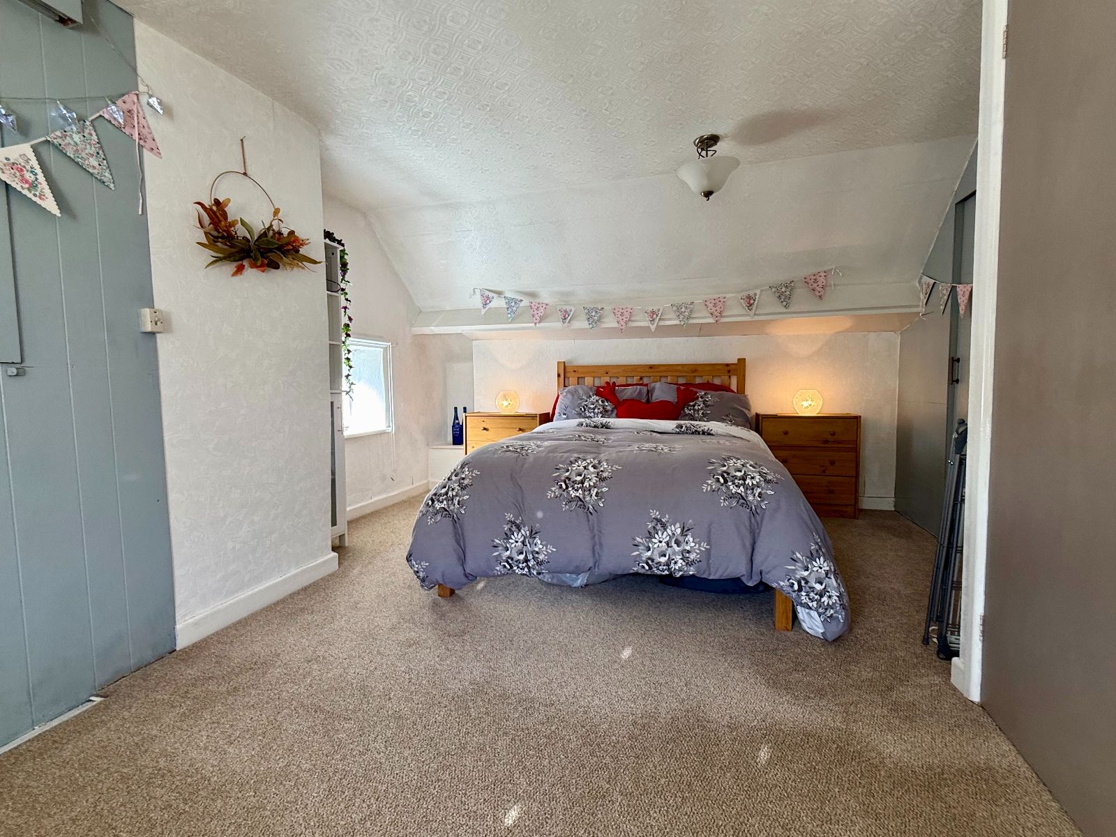 Loft access hatch, tongue and groove panelled walls, carpet.