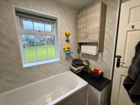 Window to rear, wet wall panelling, panel bath with electric shower above, Bi-fold shower screen, vanity wash hand basin, 2 wall units (1 housing immersion heater), heated towel rail/radiator, laminate flooring.