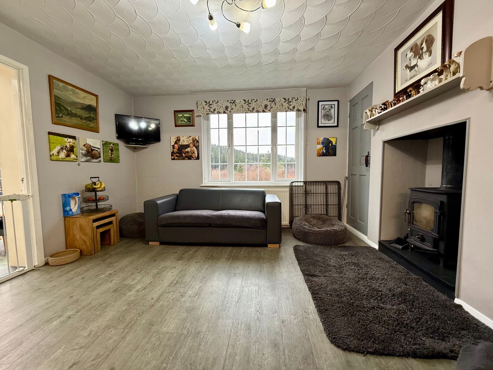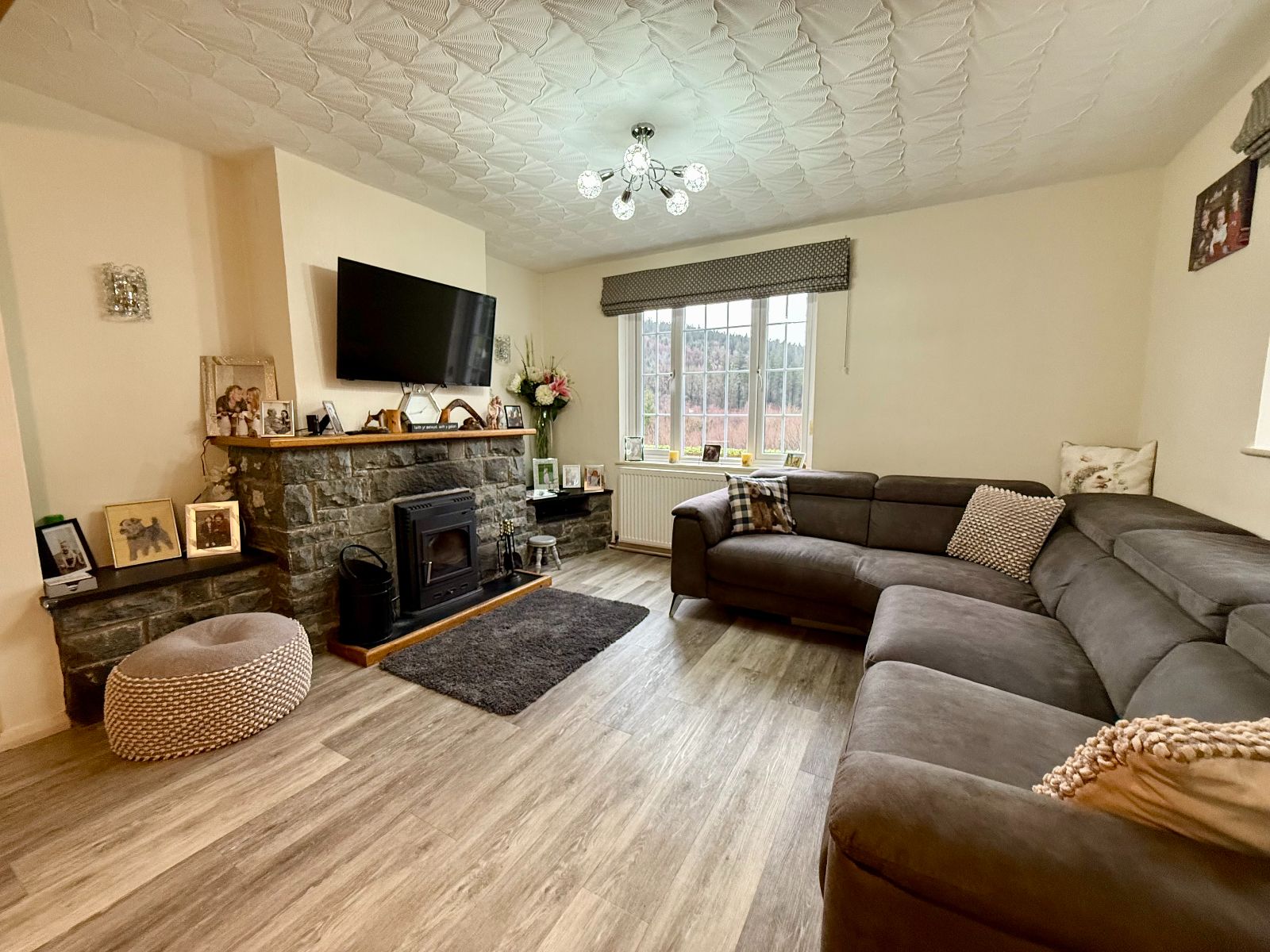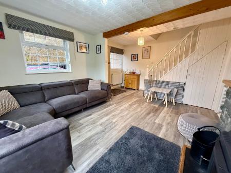 Door to side, 2 windows to side, window to front, understairs storage, stone feature fireplace with inset multi-fuel stove on a slate hearth, 2 radiators, laminate flooring.
