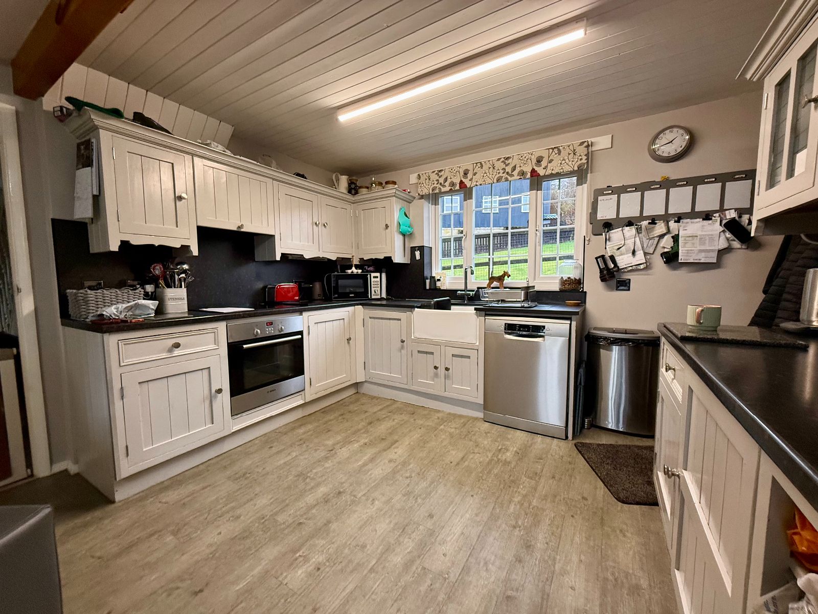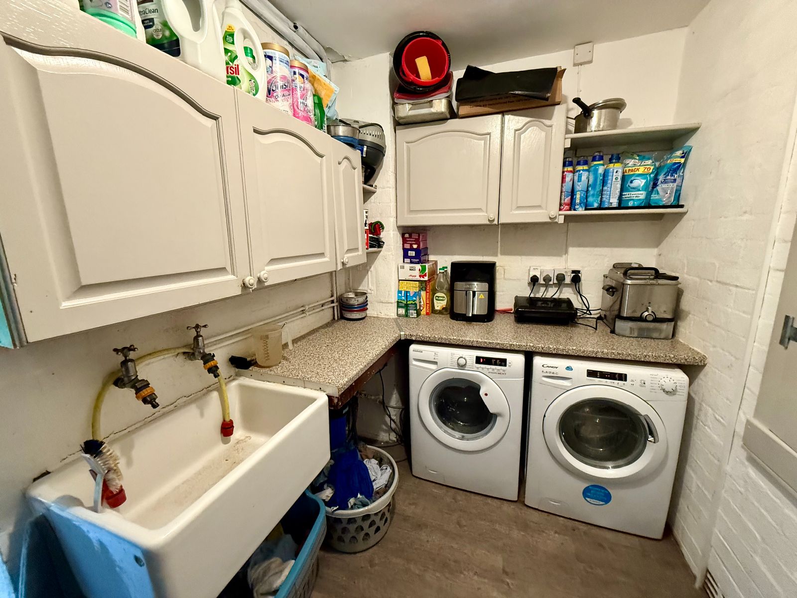 Belfast sink, granite effect worktop, space for washing machine and tumble dryer, built-in cupboard, laminate flooring.