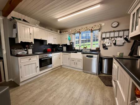 Window to front, window to rear, door to side, exposed beams. 8 wall units, 11 base units under a marble effect worktop, marble effect splashback, Belfast sink with slate drainer, integral oven with 4 ring ceramic hob and extractor hood above, space for dish washer.