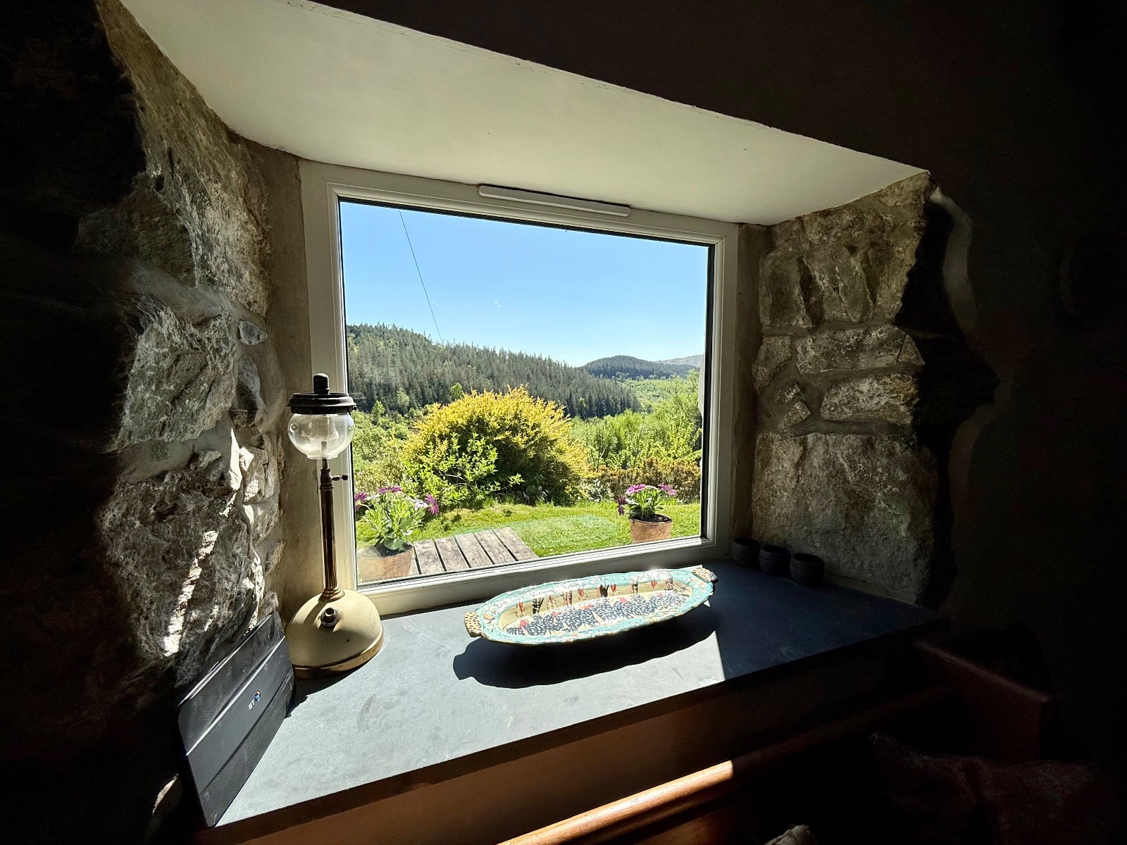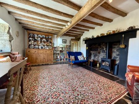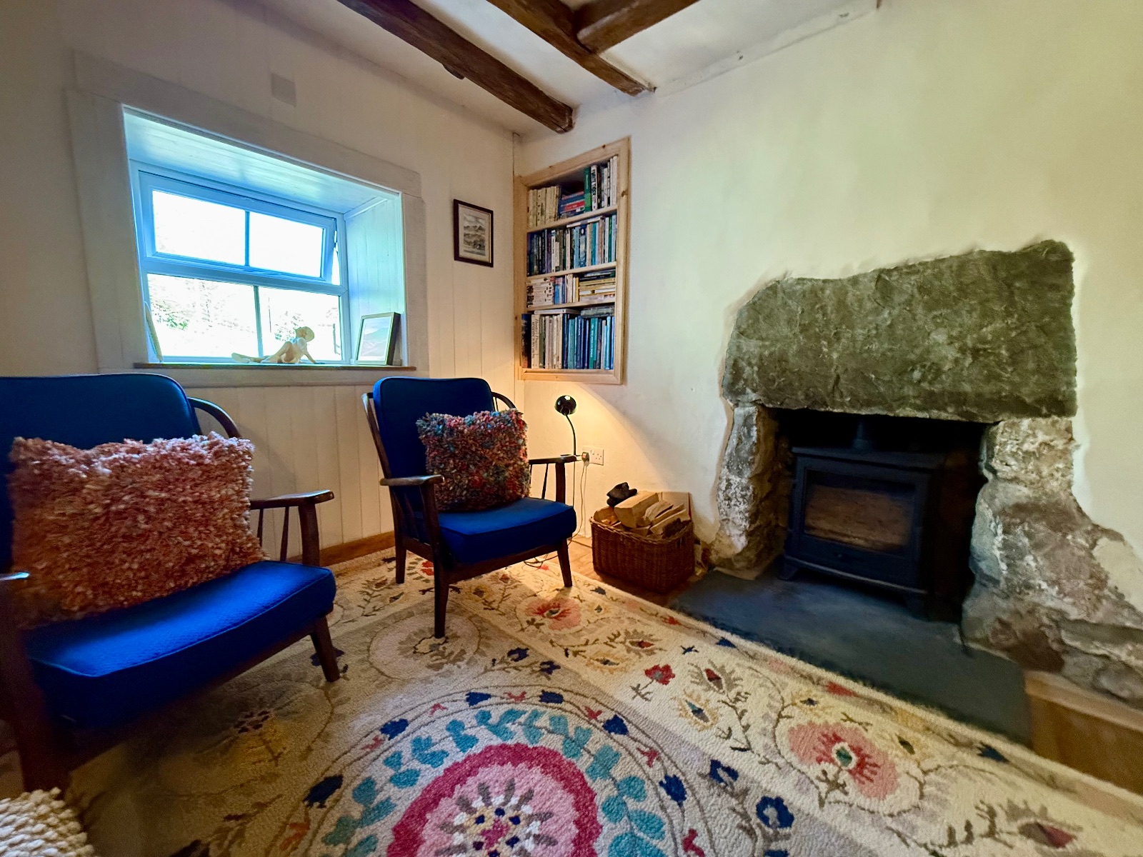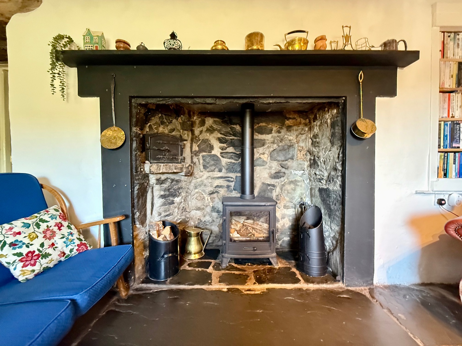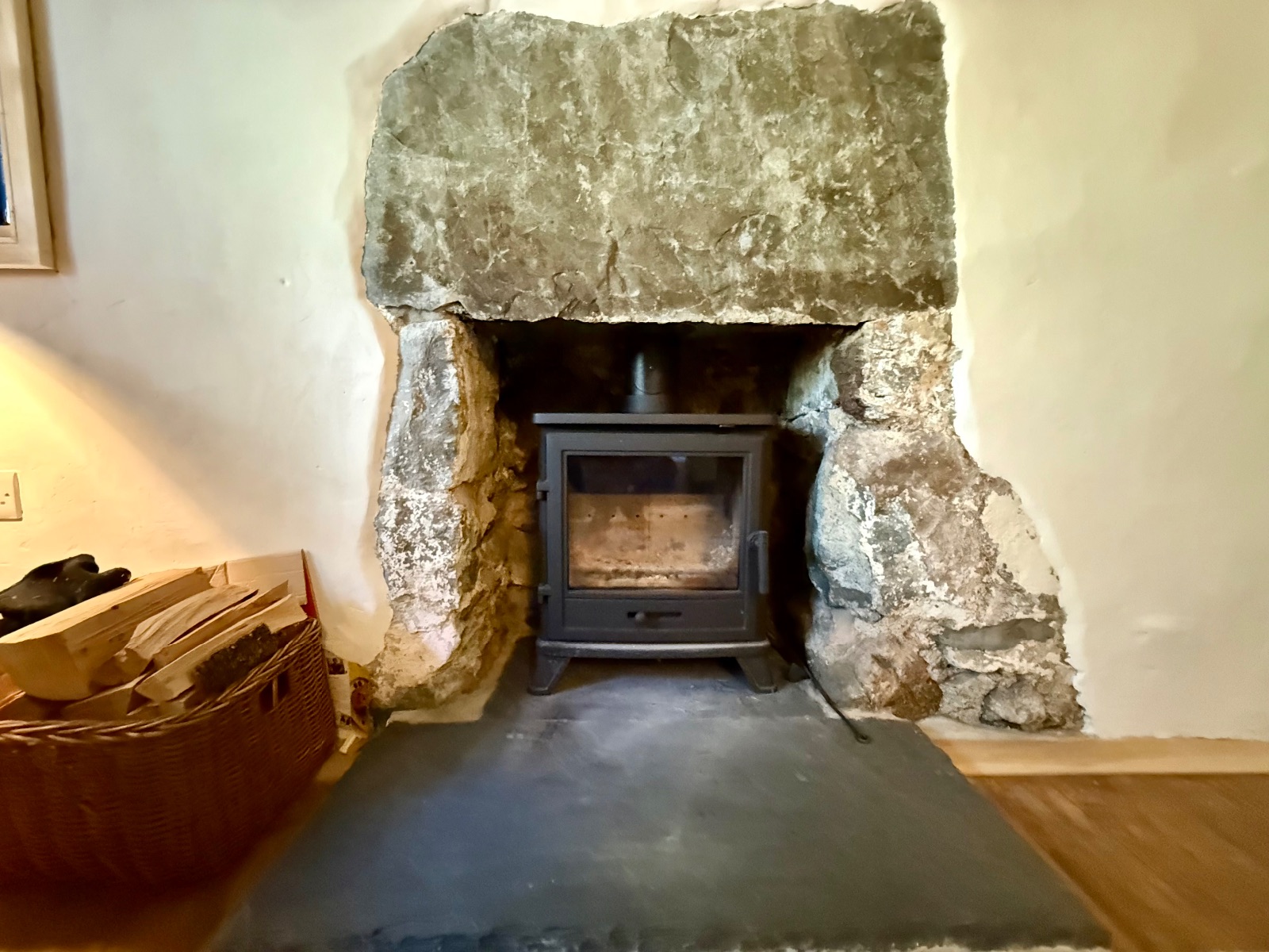 Window to side enjoying mountain views, exposed beams, feature stone fireplace housing multi-fuel stove on a slate hearth, original bread oven, partly exposed stone walls, built in shelving, slate flag flooring.