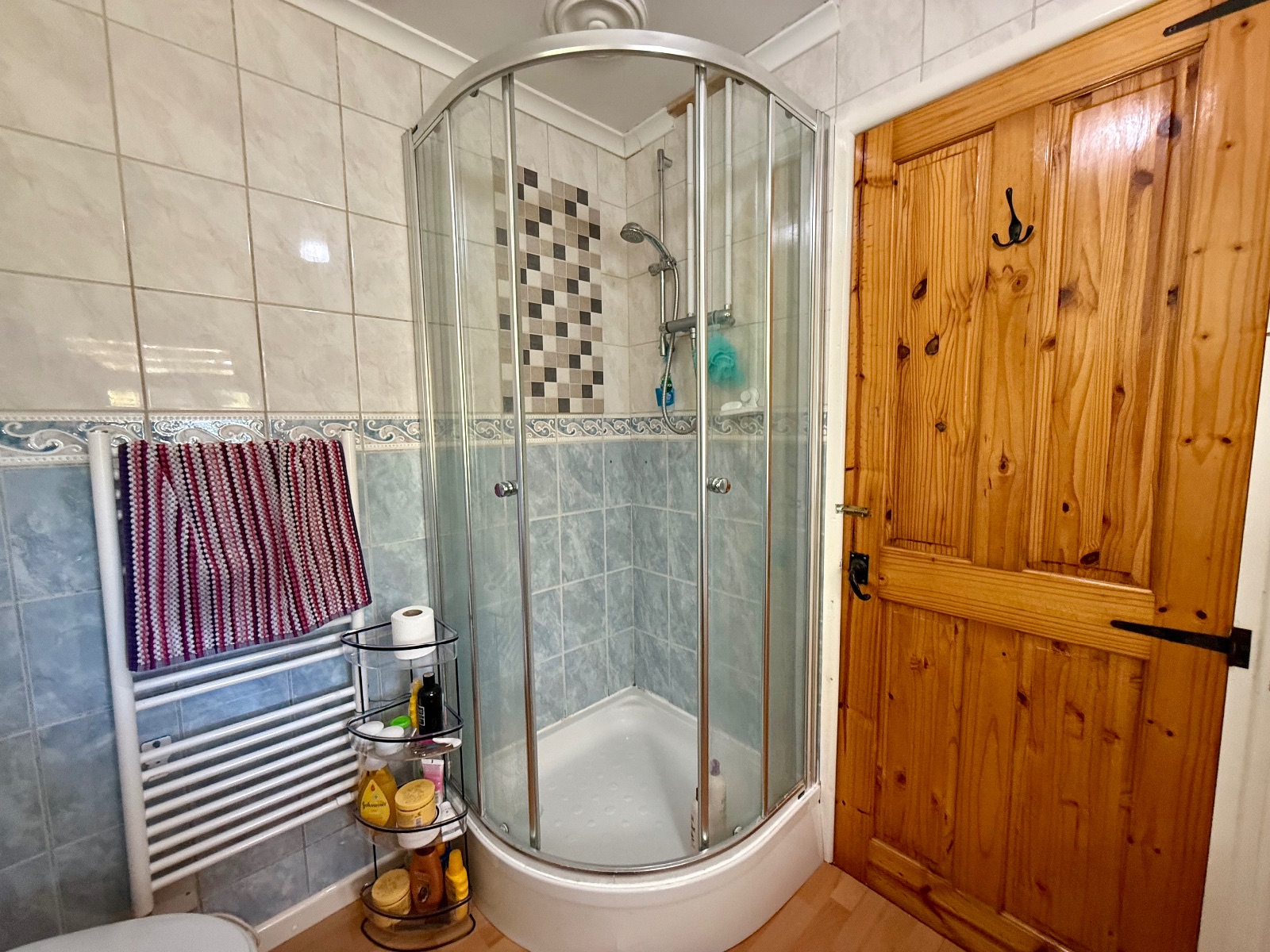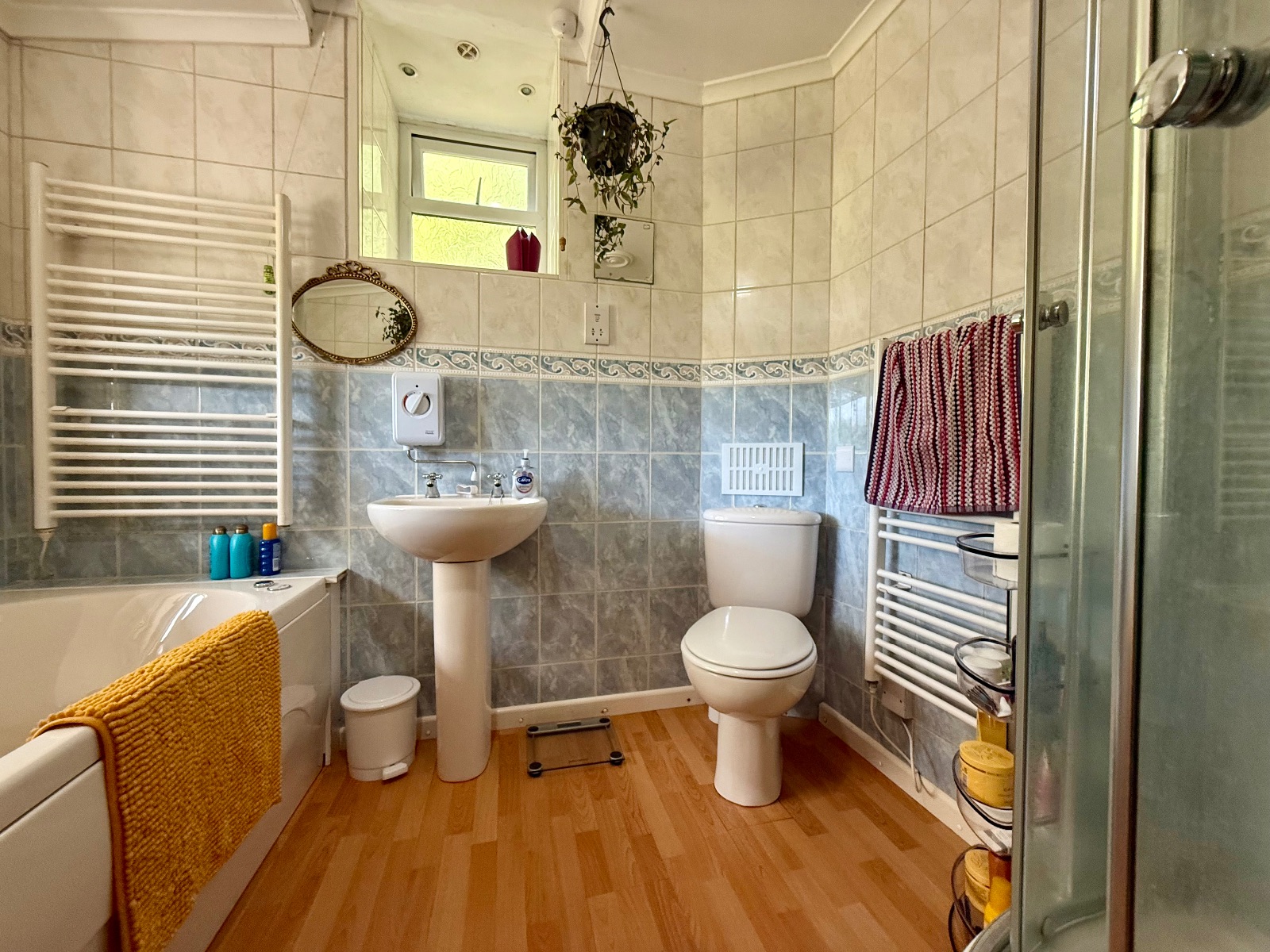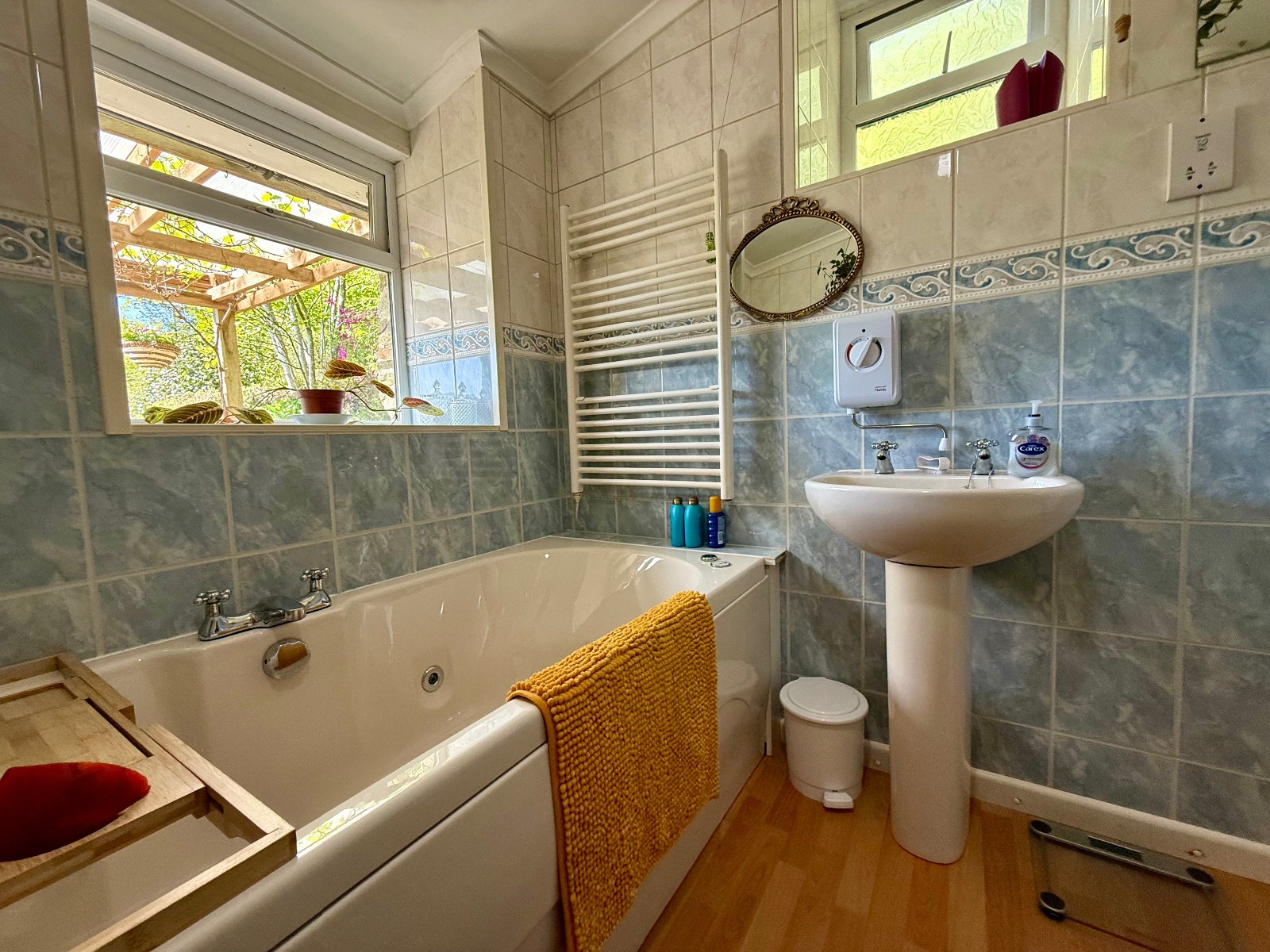 Window to side and rear, fully tiled walls, spa bath, separate shower cubicle with mains shower, pedestal wash hand basin with electric water heater above, low level W.C., 2 heated towel rails, laminate flooring.