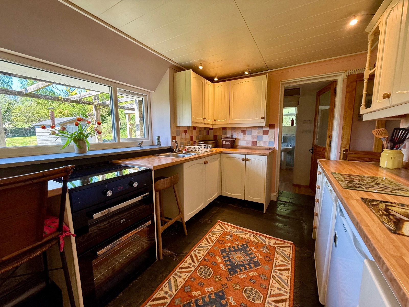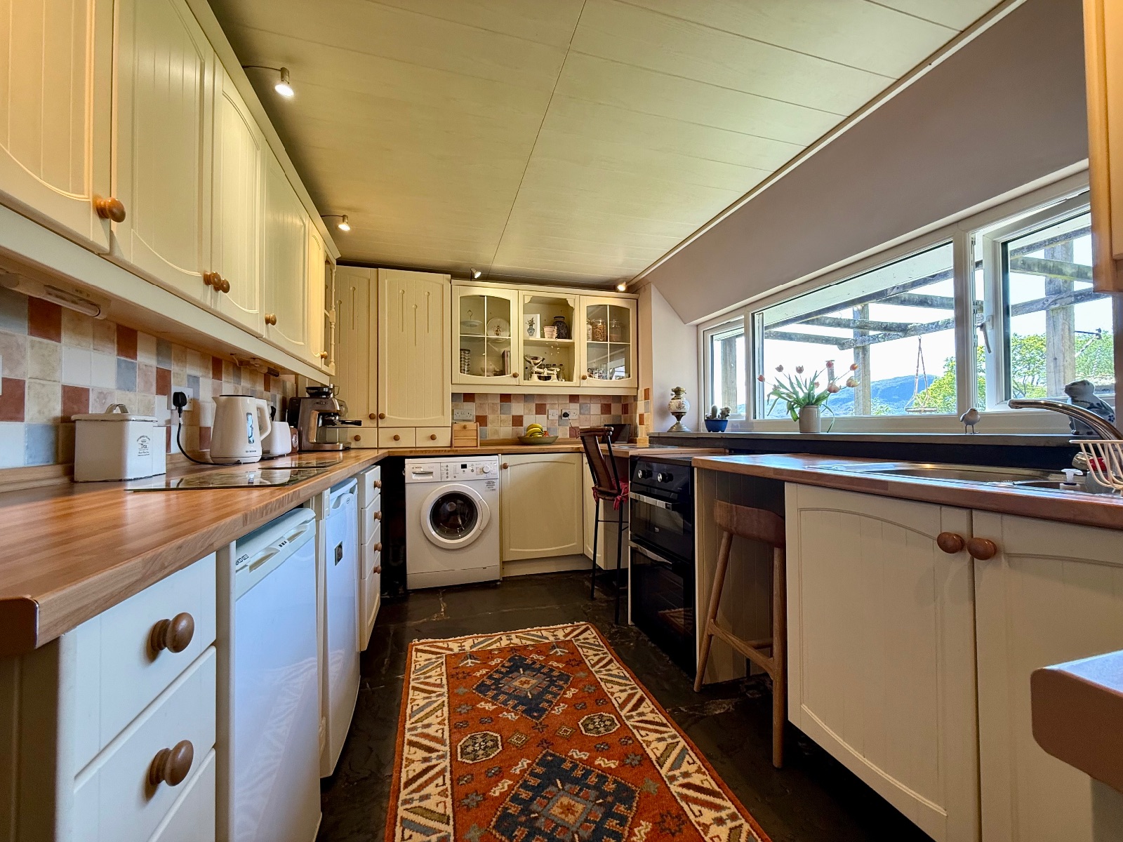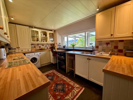 Large picture window to the side with slate window sill, panelled ceiling, 14 wall cupboards, 8 base units under timber effect worktops, tiled splash backs, 1 1/4 stainless steel sink and drainer, space for electric cooker, space for fridge, space for washing machine, space for fridge and freezer and slate flag flooring.