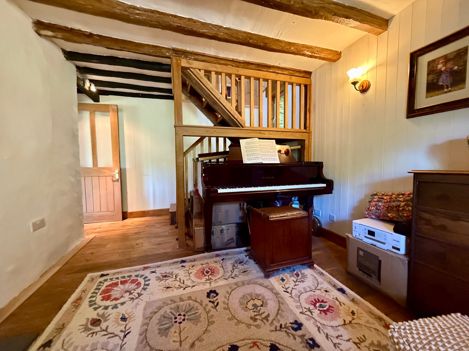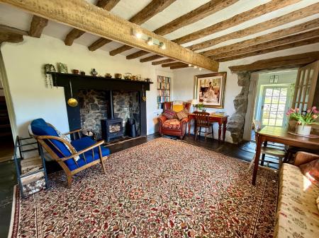 Window to side, exposed beams, panelled walls, fireplace housing multi fuel burner with a slate hearth, bespoke oak staircase leading to first floor landing, solid oak floor.