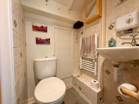 Low level W.C., wash hand basin with electric heater above, heated towel rail, airing cupboard, extractor fan.