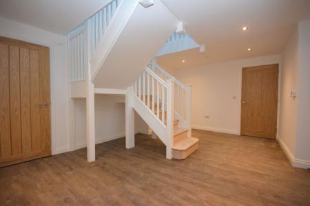 Door to front, double doors to side leading into open plan kitchen/dining room, staircase to first floor, storage cupboard, door to rear, radiator, laminate flooring.