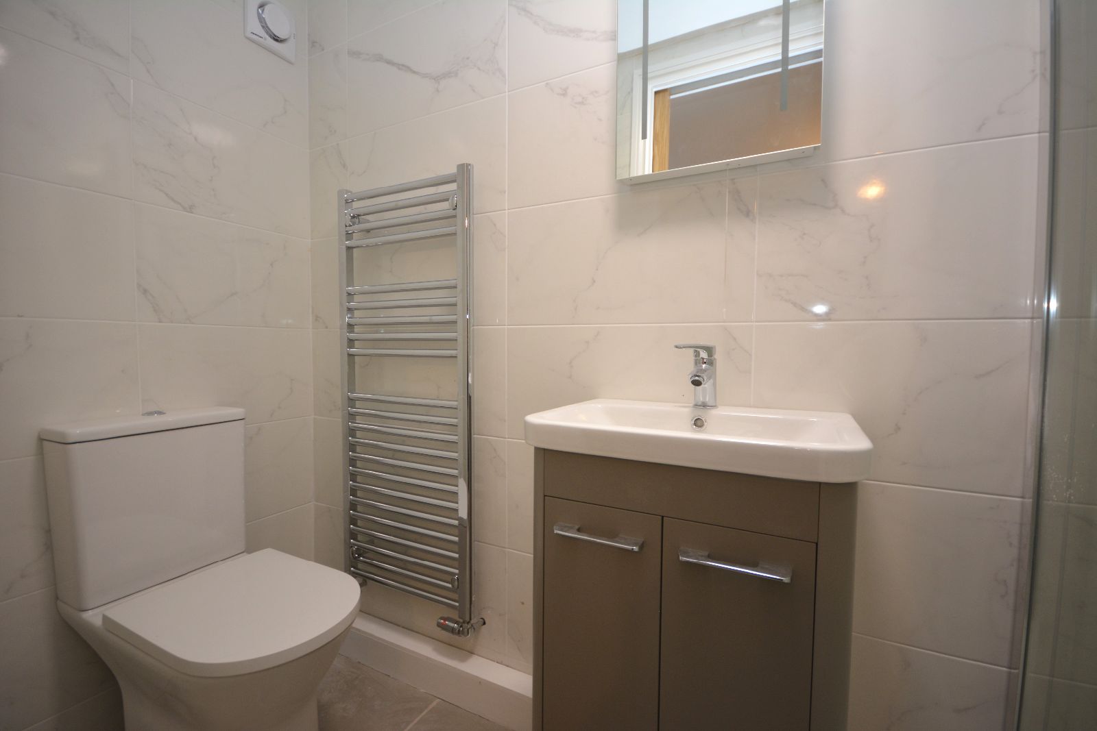 Fully tiled walls, shower cubicle with mains shower, extractor fan, vanity wash hand basin unit, LED illuminating mirror, low level WC, heated towel rail, tiled flooring.
